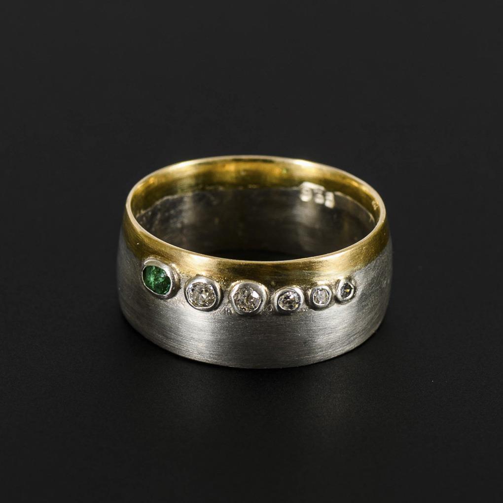 Wide band ring with small casket set emerald, 5 diamonds and narrow yellow gold edge.