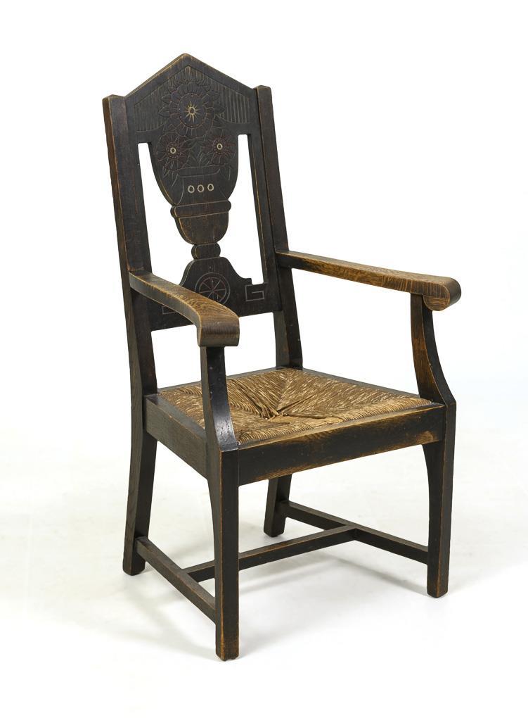 Arm chair with trapezoidal seat of rush wicker and relief decorated back with floral bouquet. Signs of age/use, rush wicker defective.