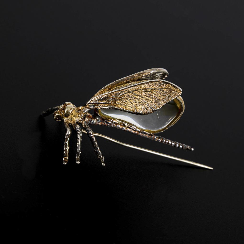 Plastic designed brooch with citrine?cabochon set in circles on long needle.