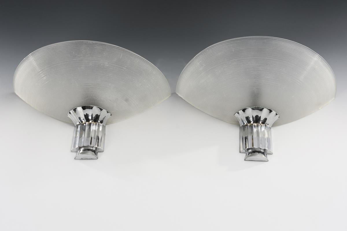 2 timeless 1-light sconce lamps with ribbed half-shell shade and columnar fixture. Signs of age/use, glass edges with small chips, chrome plating partially detached.