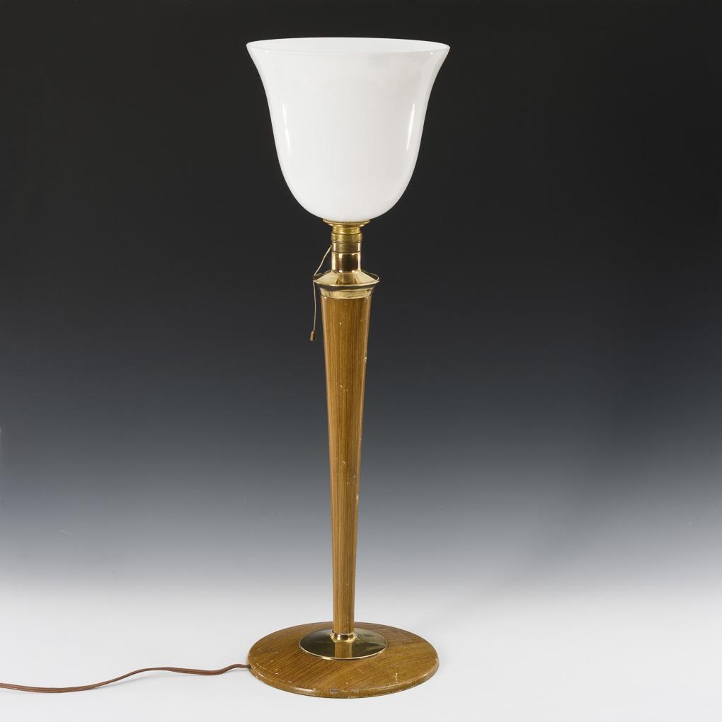 Iron and wood each lacquered wood color, iron brass plated, brass, clear glass with white interior catch. H 78 cm, Ø shade 24 cm.