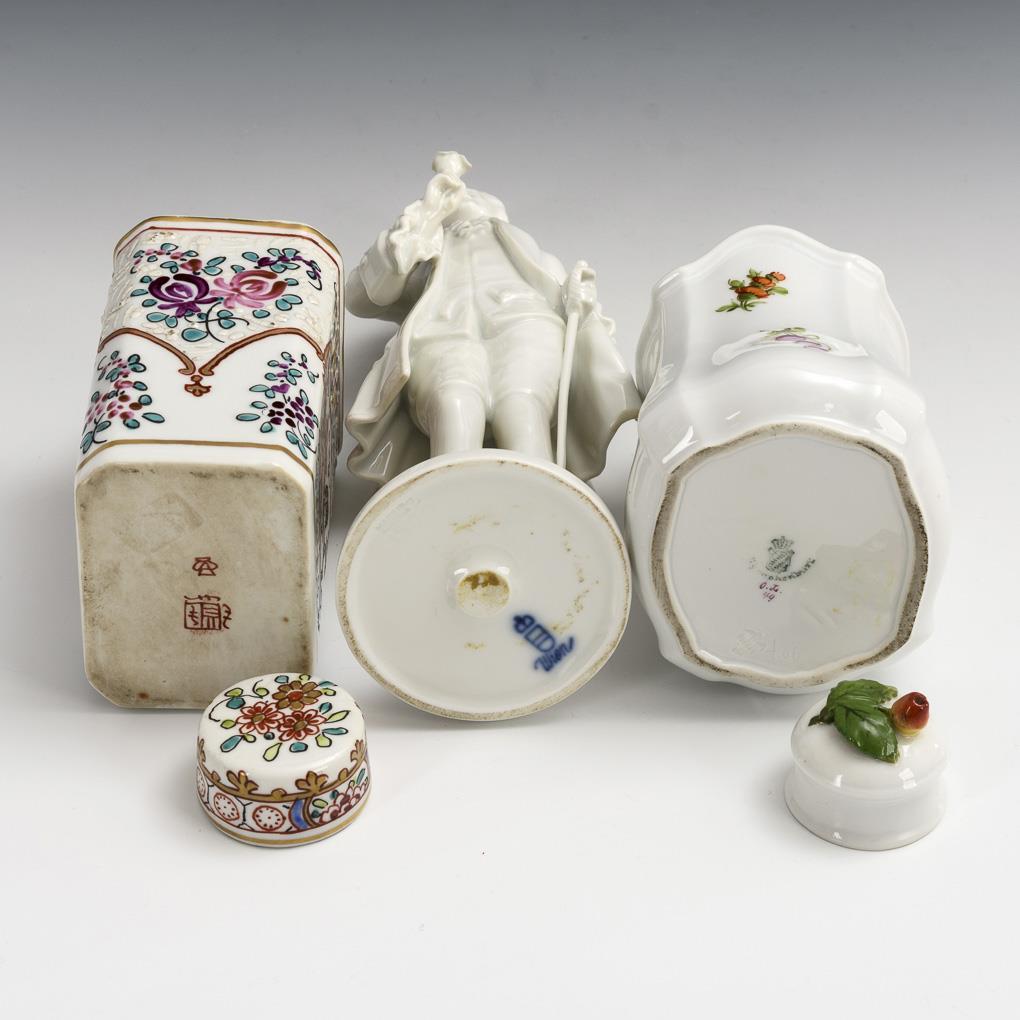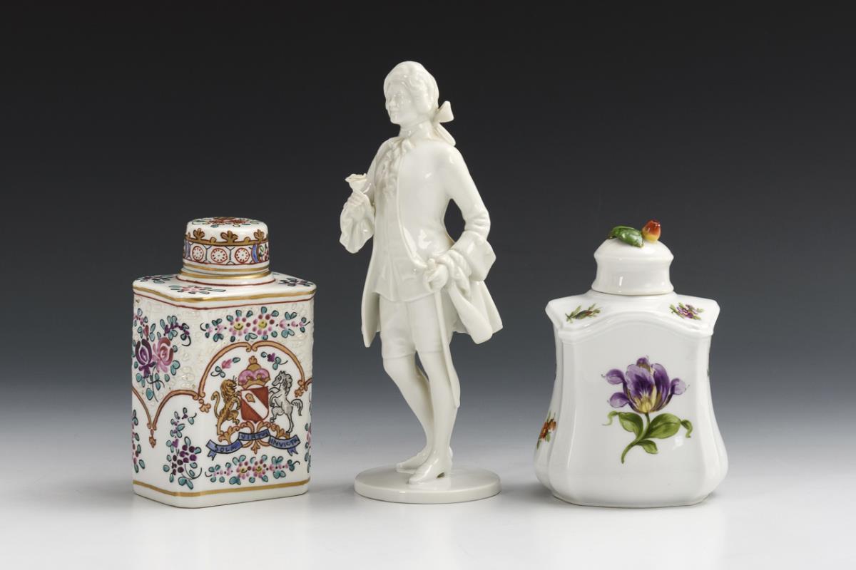 1x Samson, Chinese imitation mark, late 19th century: on the front side the representation of the coat of arms of the English noble family Howard (Duke of Norfolk) flanked by a lion and a horse, under the coat of arms the motto "SOLA VIRTUS INVICTA" (Virtue alone is invincible). / 1x Nymphenburg, 1912-1975: passige tea caddy with apple knob lid and floral painting. / 1x Augarten, 20th century: standing rococo cavalier with sword, holding a rose in his hand. Apple knob lid restored, bump on the apple knob, rose bumped.