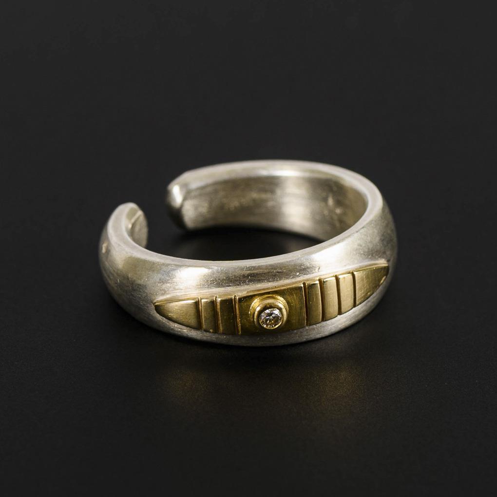Open, wide band ring with casket-set, small diamond on yellow gold-plated center.