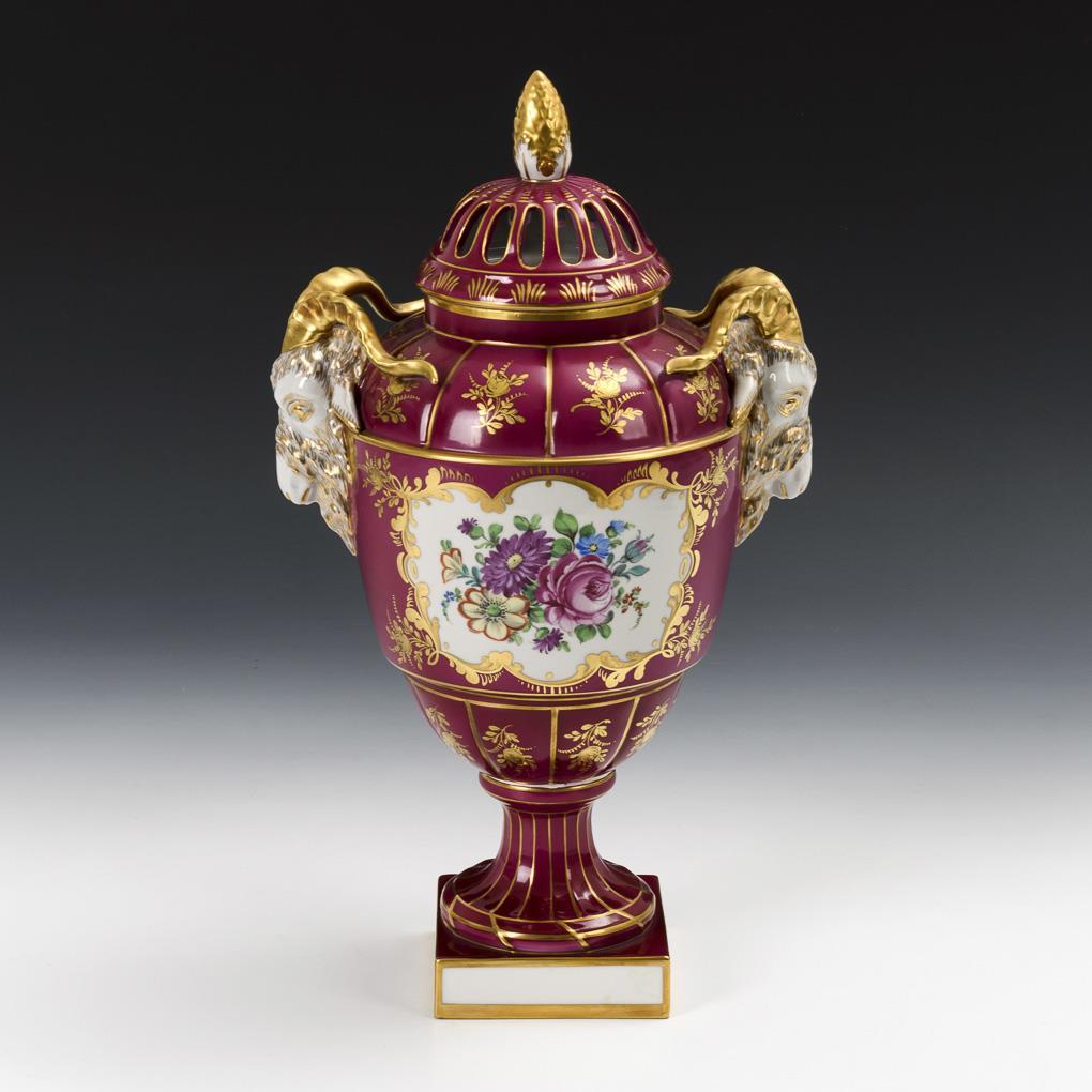 Ovoid, partially straight godroned body with two ram's head handles, openwork knob lid and round base, on square plinth. Purple background with floral gold painting. On the front a floral framed cartouche with a bouquet of flowers.