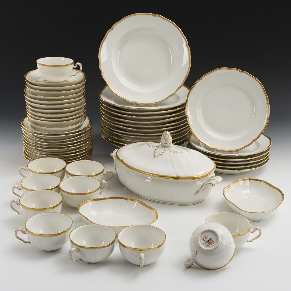 English smooth model. 7 dinner plates, 5 soup plates, 6 appetizer plates, 11 dessert plates, 11 cups with 11 saucers, 2 oval bowls (L each 17 cm) and 1 lidded bowl (L 29 cm). Gold partially rubbed, 1 cup with hairline crack on the handle.