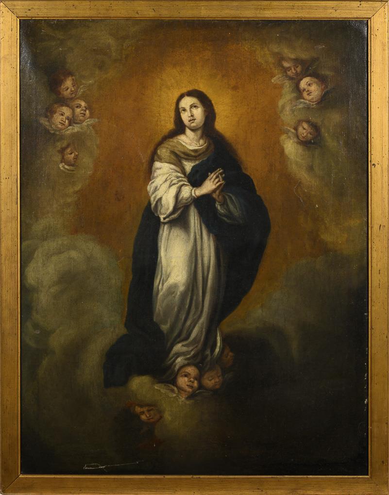 Mary looking up, standing on the crescent moon in the clouds. canvas doubled, traces of age.