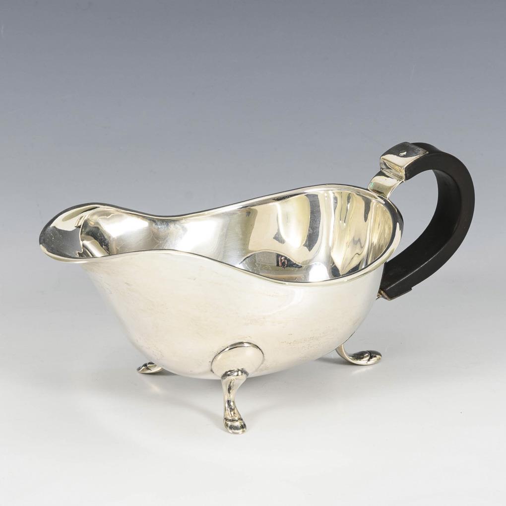 Elegant sauce boat with black bakelite handle. Small dent in the wall.