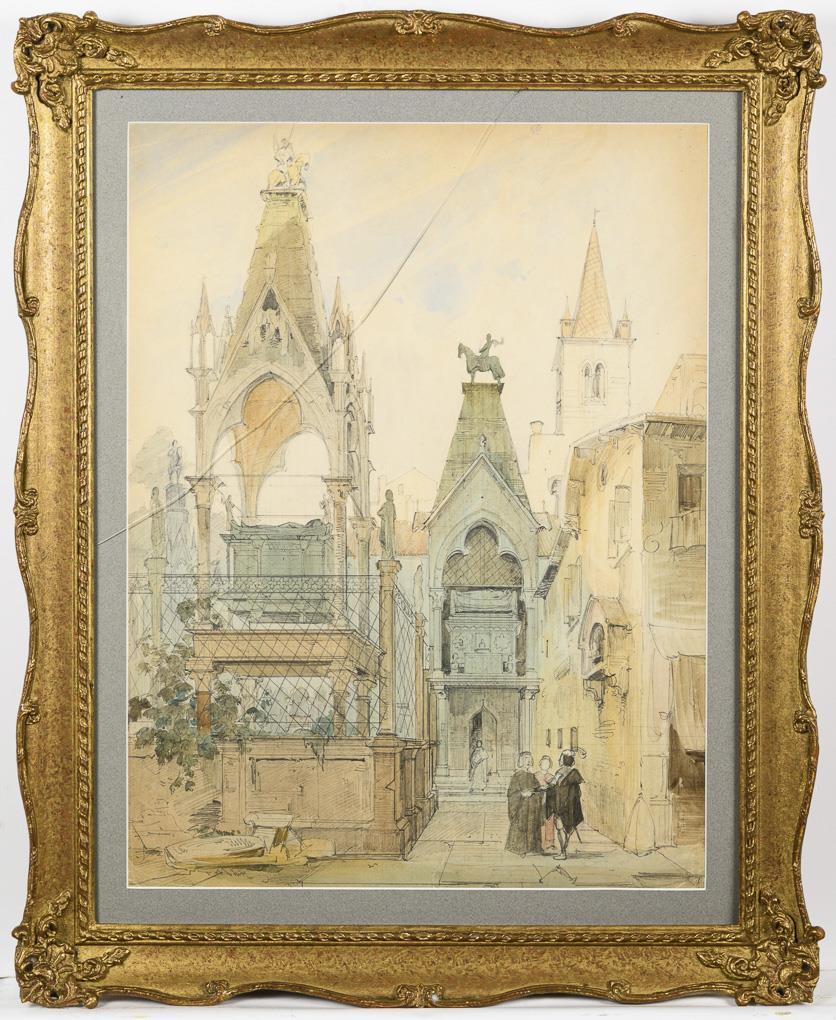 Staffage figures in front of the filigree tomb. Slight creases in the corners.