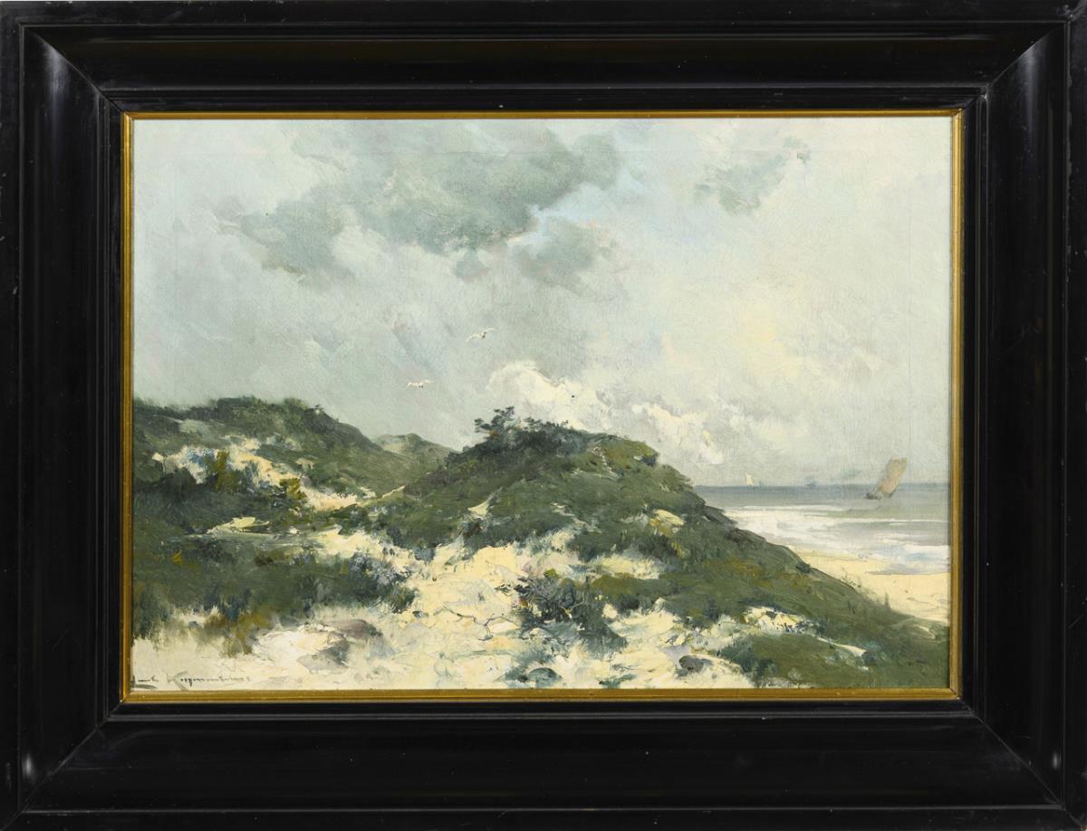View over the dunes overgrown with grass to the sea with the sailors. A restored place with backing.
