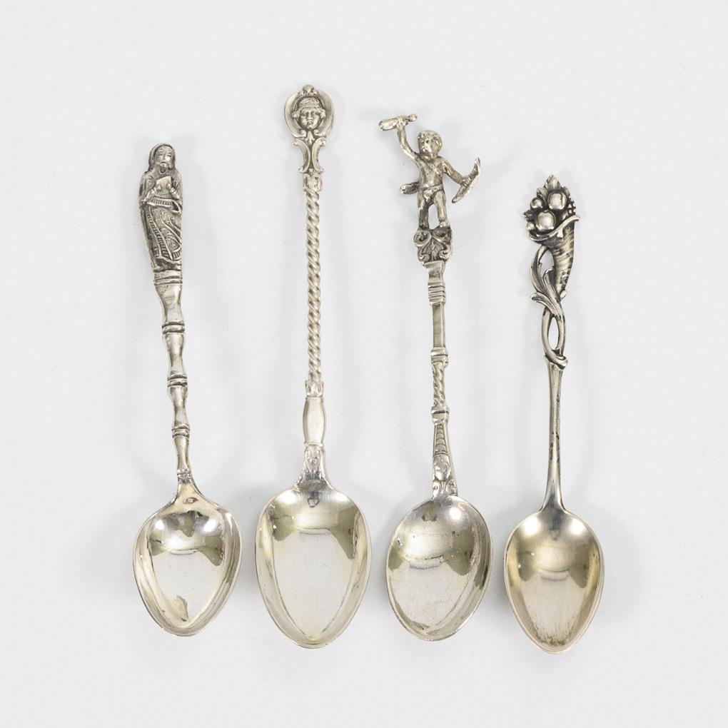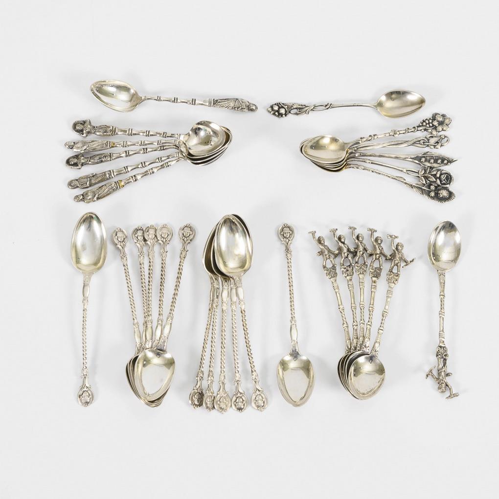 12x with putto head, 6x with cupid, 6x with various flowers and 6x Asian with figures at the end of the handle.
