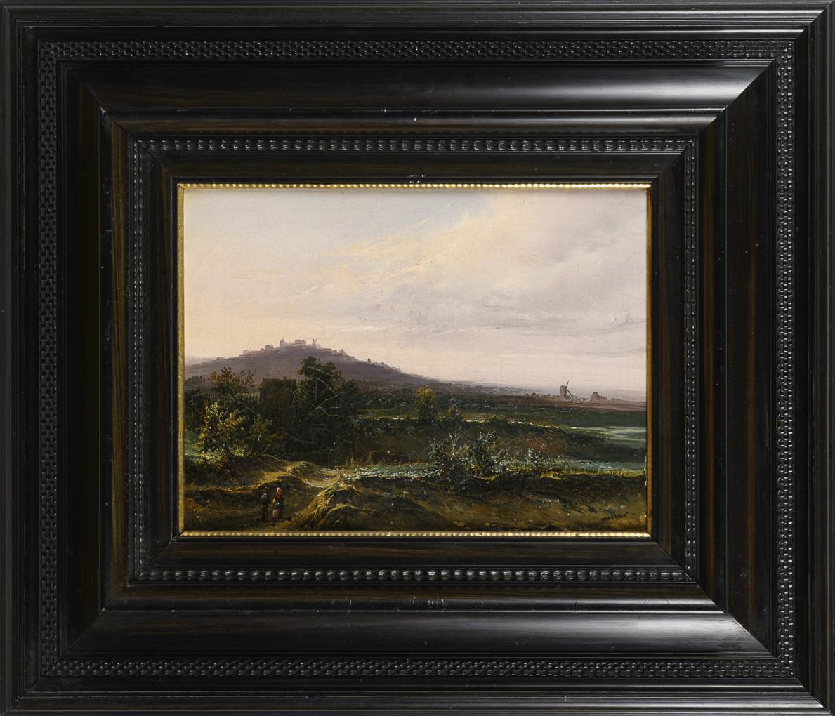 Staffage figures near a house with a view in the distance to the city with the mill under cloudy sky. Restored.