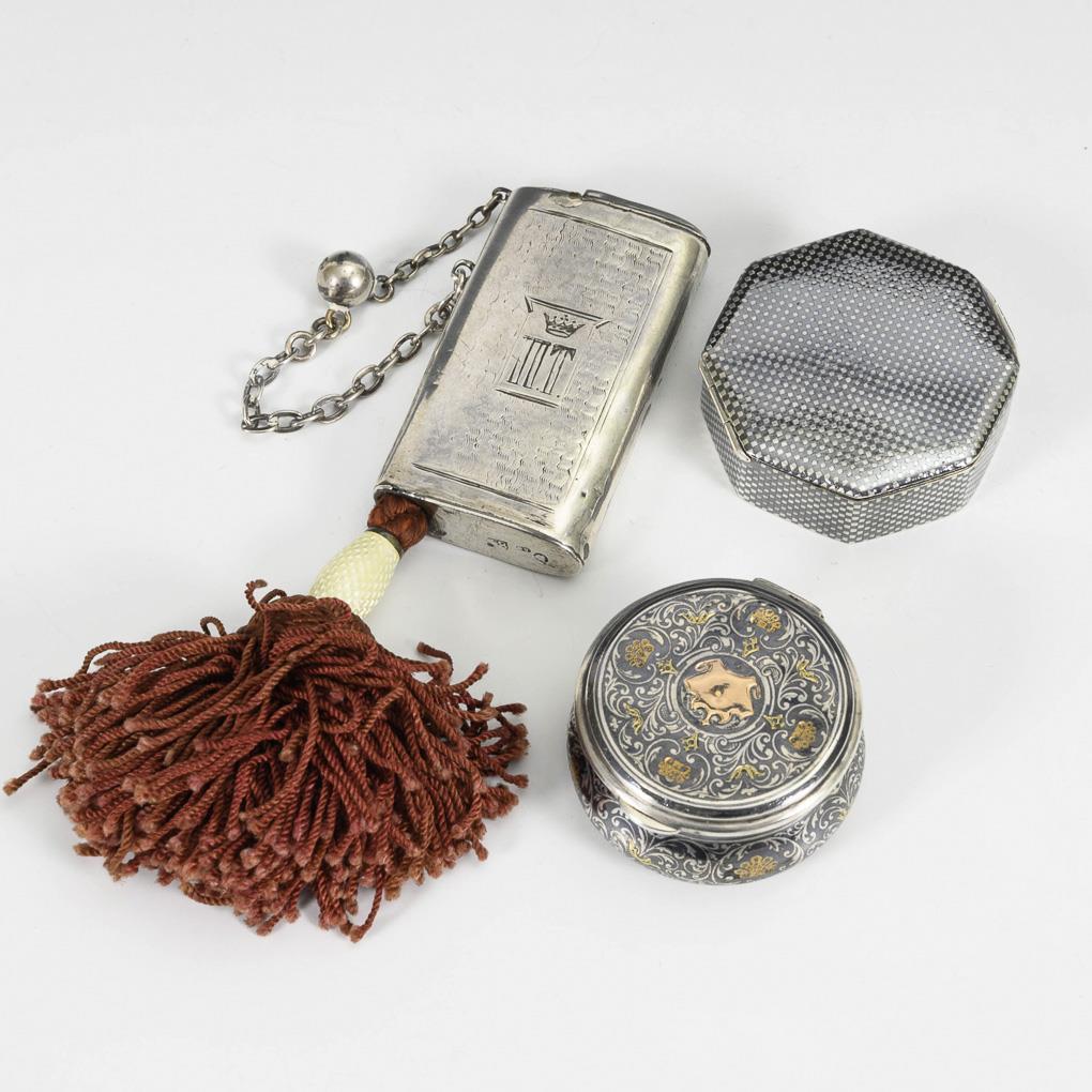 Viennese box in niello technique with gold inlays, Ø 4,5 cm. 8-cornered box (probably Swedish) with fine niello check pattern, Ø 4,5 cm. Russian match case with crowned monogram engraving "PT" and decorative tassel. Signs of use, small dents. Case worn.