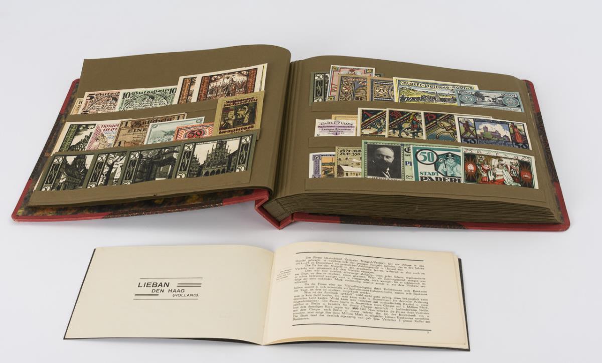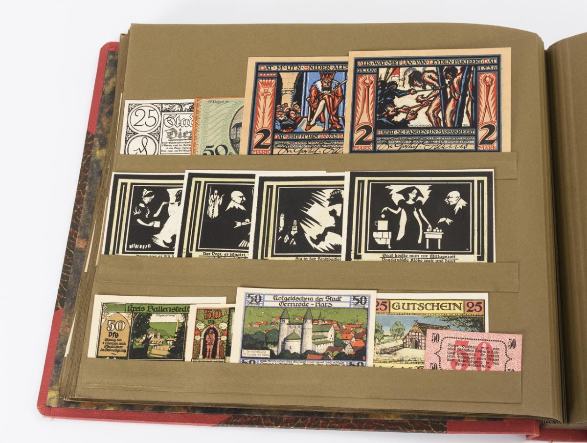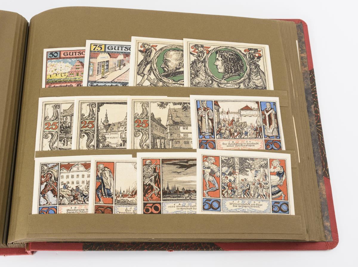 Red cover with gold embossing: "Notgeld 1915-1924". Richly plugged album with German and Austrian Notgeld, factory, industrial and municipal Notgeld and German Reichsgeld. Album and most bills as new, some bills torn.
