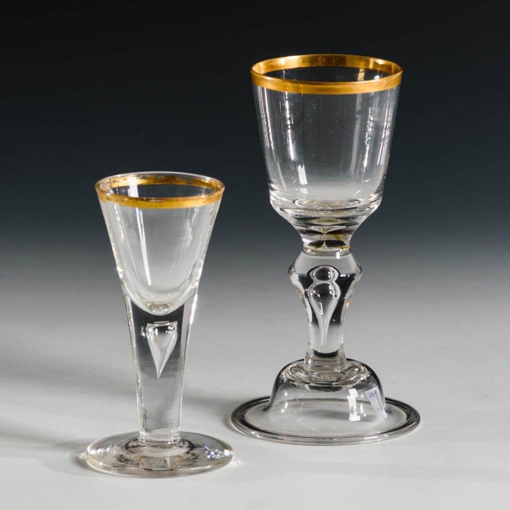 1x konische Kuppa, Schaft mit eingestochener Luftblase, hutförmiger Fuß mit umgeschlagenem Rand und Abriss. / 1x konische, in den massiven Schaft mit eingestochener Luftblase übergehende Kuppa, Rundfuß. 1x Gold berieben.