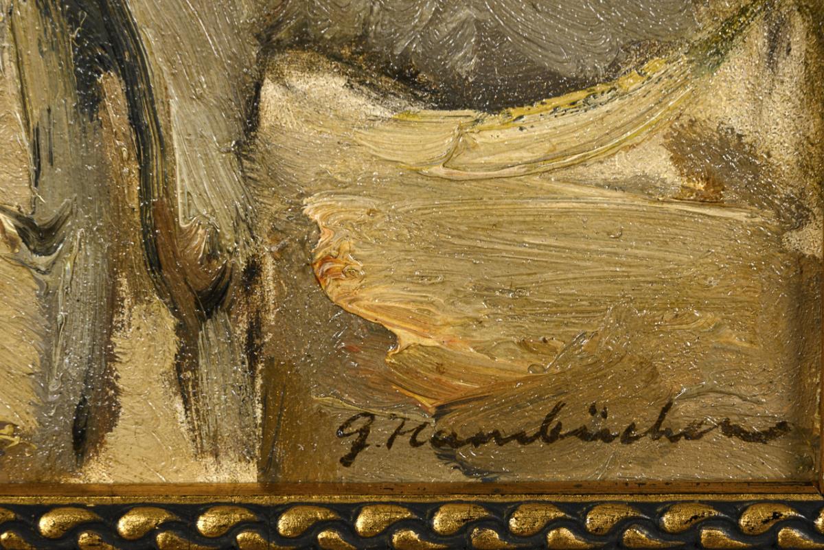 Oil/painted cardboard. Signed lower right, verso motif statement with note "bought in the studio Wildenbruchstr. by Mrs. Hambüchen on 30.7.1973 DM 300, -".