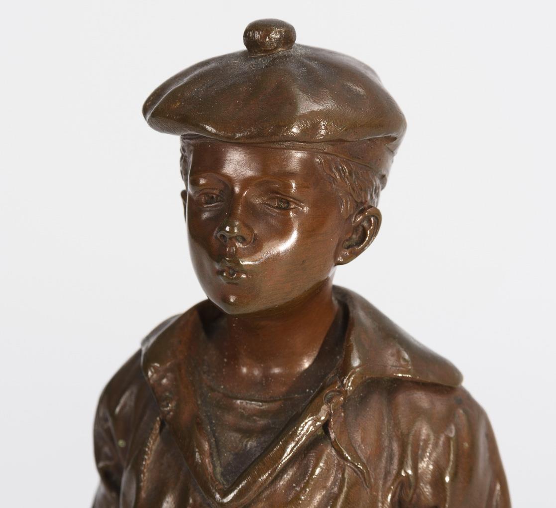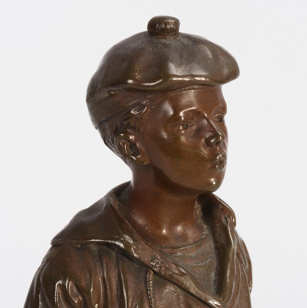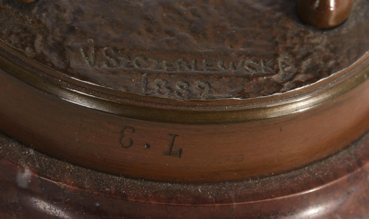 Bronze red-brown patinated, red marble plinth. Inscribed with date "1889". H 21 / 23 cm.