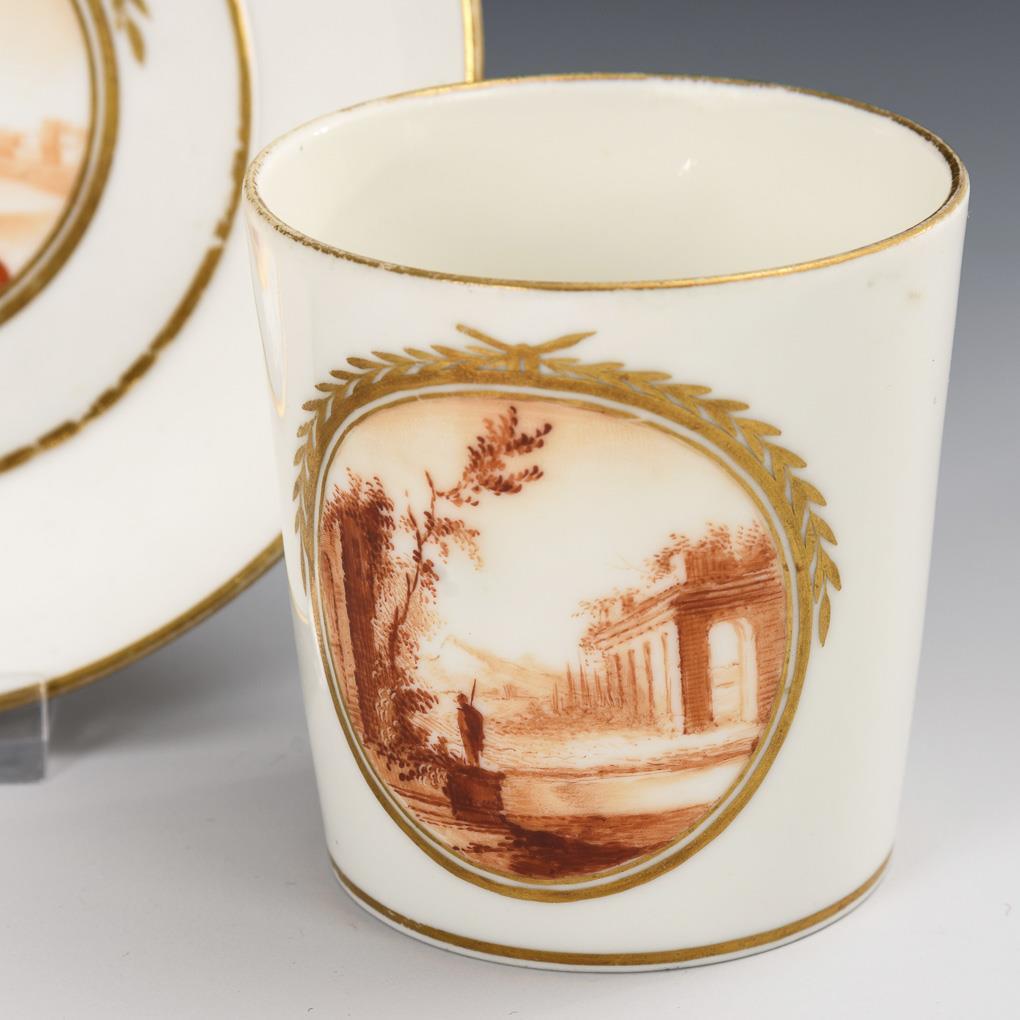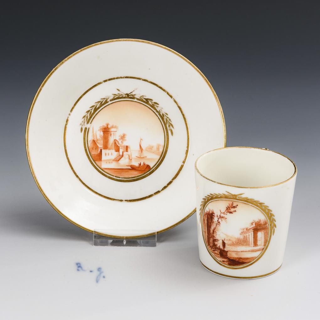 Slightly conical cup with angled handle. On the front of the cup and in the mirror of the saucer a gold-framed medallion depicting ideal landscapes with architecture and staffage. Minimal gold abrasion.