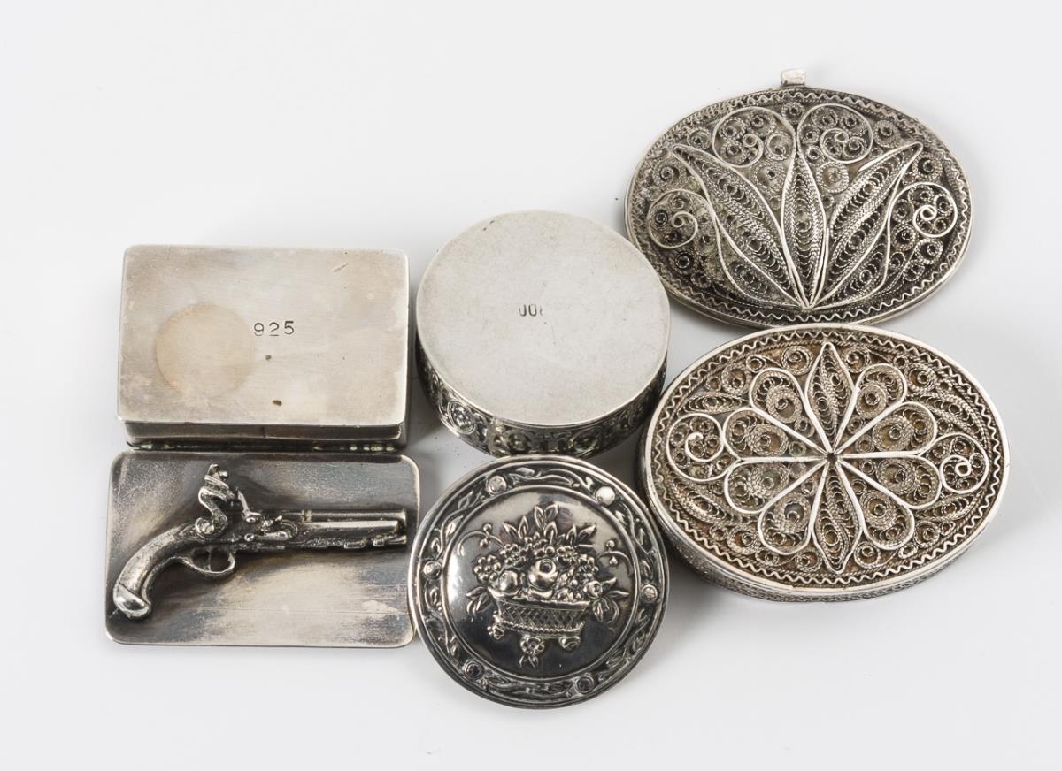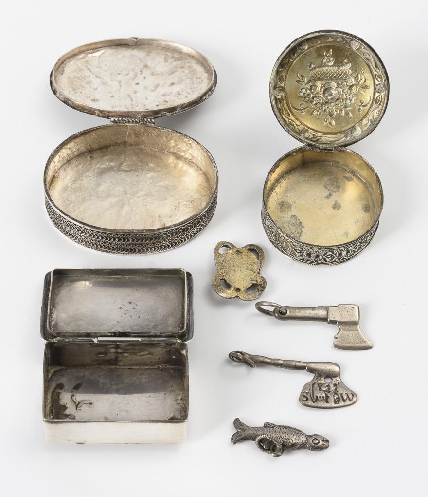 Round box with wall frieze as well as floral bouquet on the lid. / Oval box all sides (also on the bottom) with filigree. / Cuboid box with applied pistol. In addition, 3 pendants (Wolfgangshackl and fish) and 1 head applique. Minimal signs of age / use.