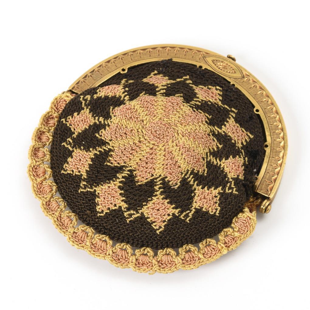 Finely crocheted and ornamentally embroidered body on both sides; arched bow on both sides with finely engraved ornamental frieze. Bow seam partly detached, glue trace ibid.