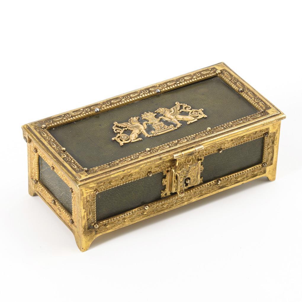 In the manner of Erhard & Sons ägytisierend designed casket with rich relief ornament and applied pair of griffins on the hinged lid. Minimal signs of age / use.