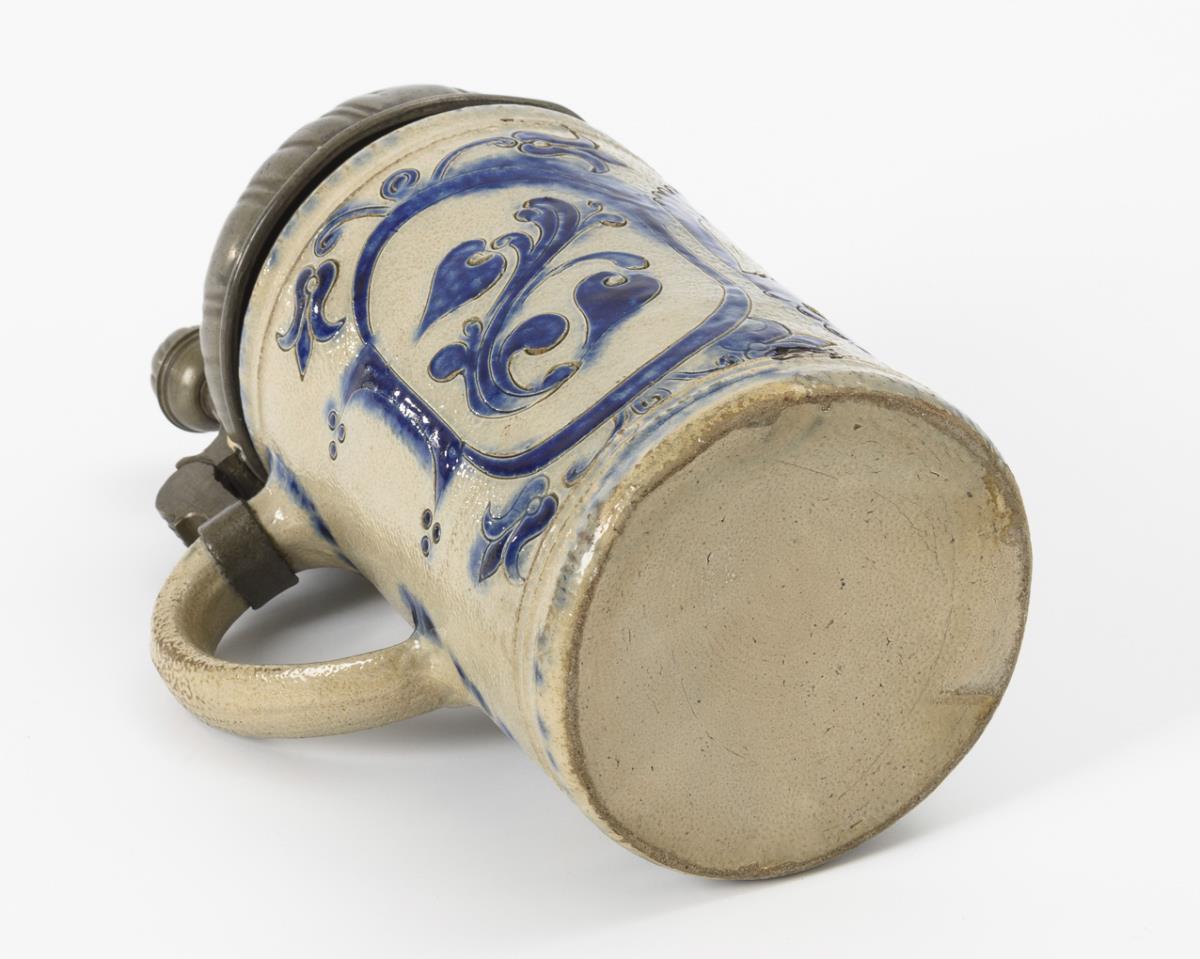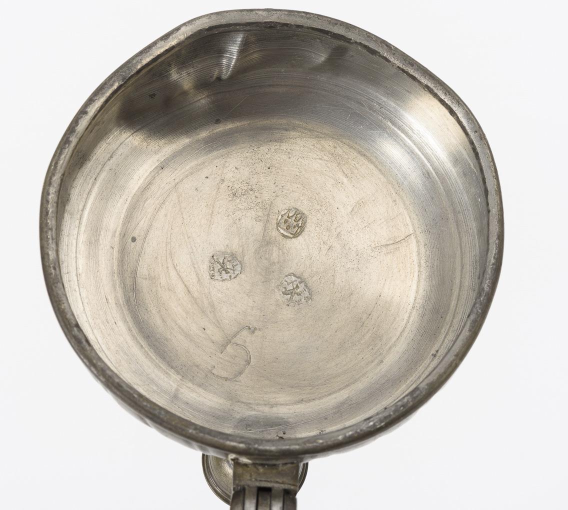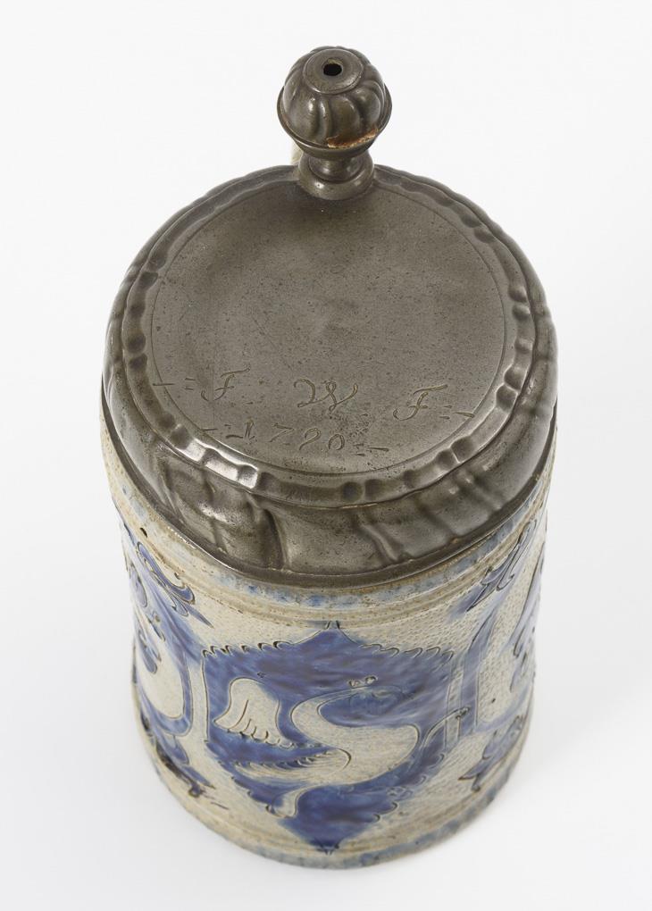 Cylindrical form with pointedly lined ear handle. Godroned pewter lid with ball pusher, engraved "FWF 1790", hallmarked inside. Pewter dented, ball with defect, small chip on rim.