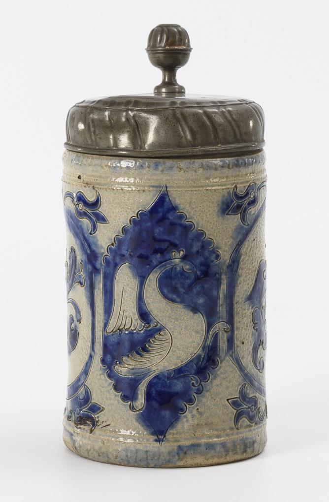 Small Westerwald roller jug with swan and flower reserves.