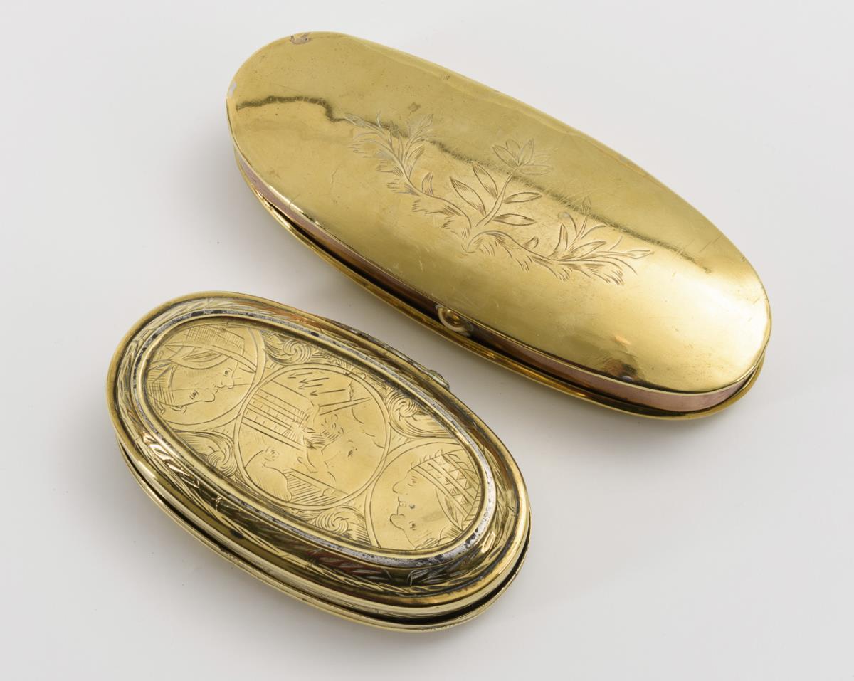 Can with copper wall engraved on the hinged lid and bottom: Couple in front of the city with motto and plant respectively / All sides with dash pattern engraved box, on the lid field several coats of arms; bottom field with 3 medallions: lion at the house in the storm, flanked by 2 heads. Each solder repairs, each age/use traces.