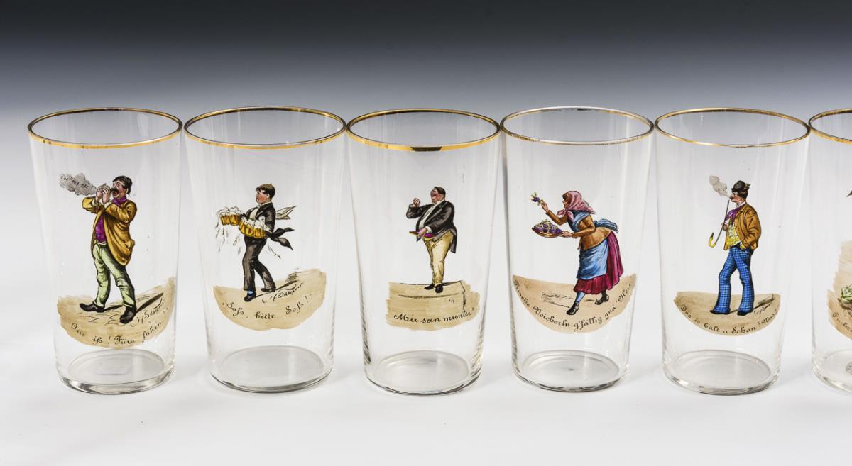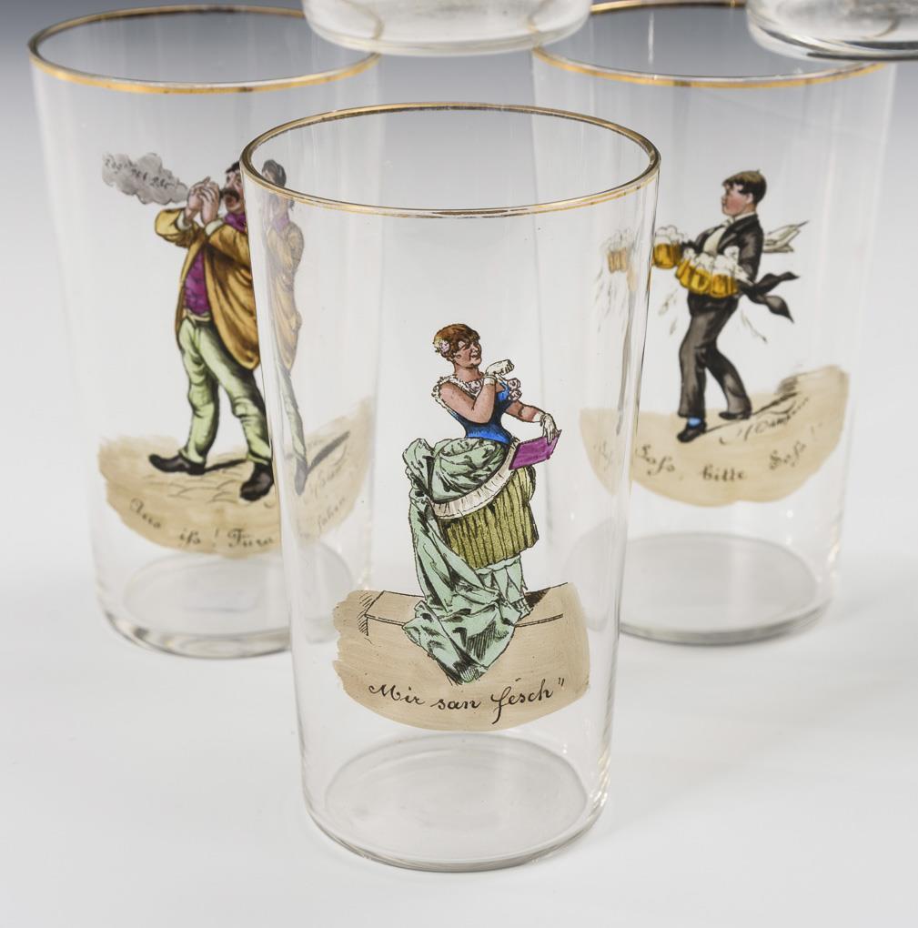 Tapered cup with depictions of figures from old Viennese life, including inscriptions. Gold rubbed.