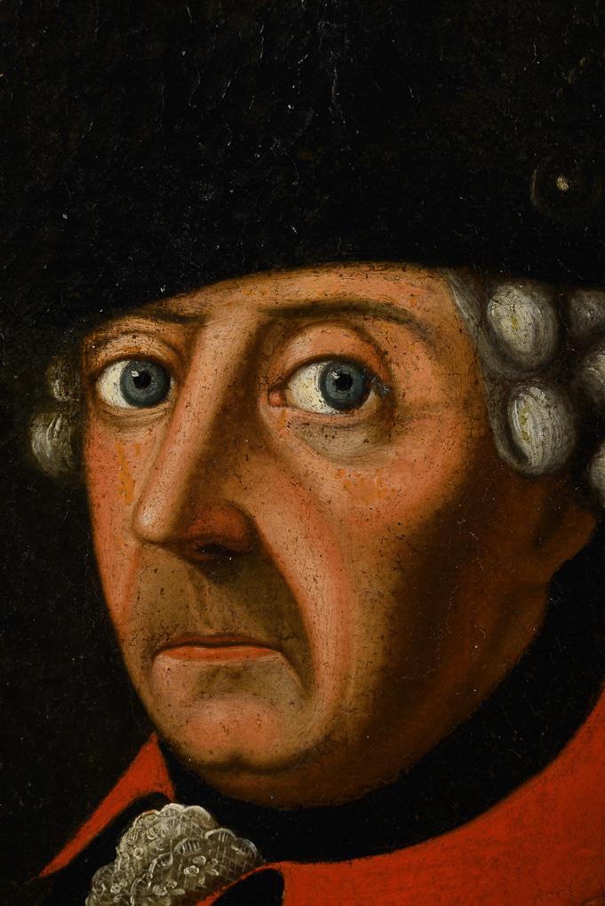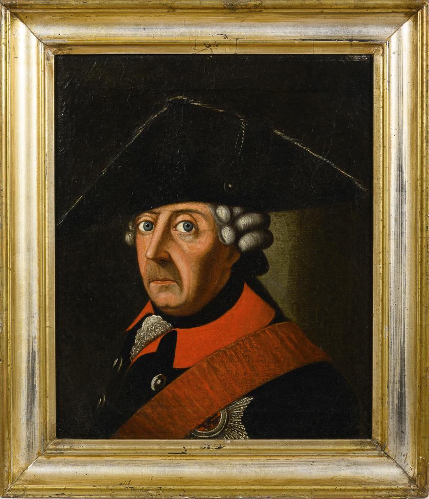 Portrait of the Old Fritz in uniform and with tricorn and breast star of the Black Eagle Order. Age traces.
