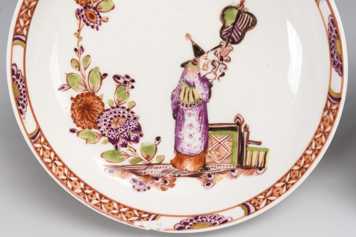 Decor probably by Johann Ehrenfried Stadler (1701-1741). In the mirror each the representation of a Chinese standing on a landscape island with fan, a geometrically patterned box, a branch with peony and chrysanthemum flowers and an insect, on the edge a lattice border with half peony flowers. 1x with edge chip, minimal bump each on the stand rings.