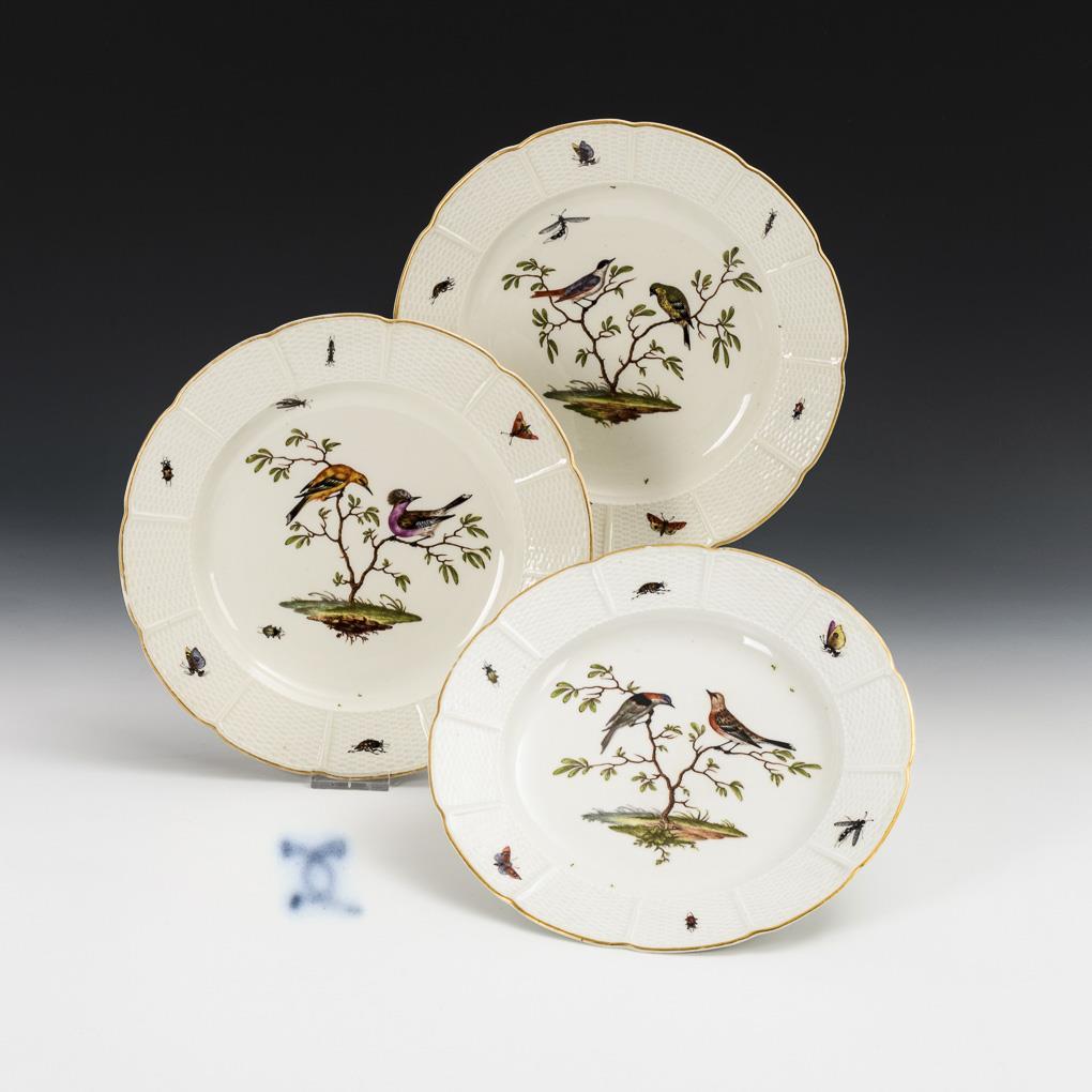 Dinner plate in the form "Altozier". In the mirror in each case the representation of a tree with two birds, on the flag, insect painting. Minimal gold abrasion.