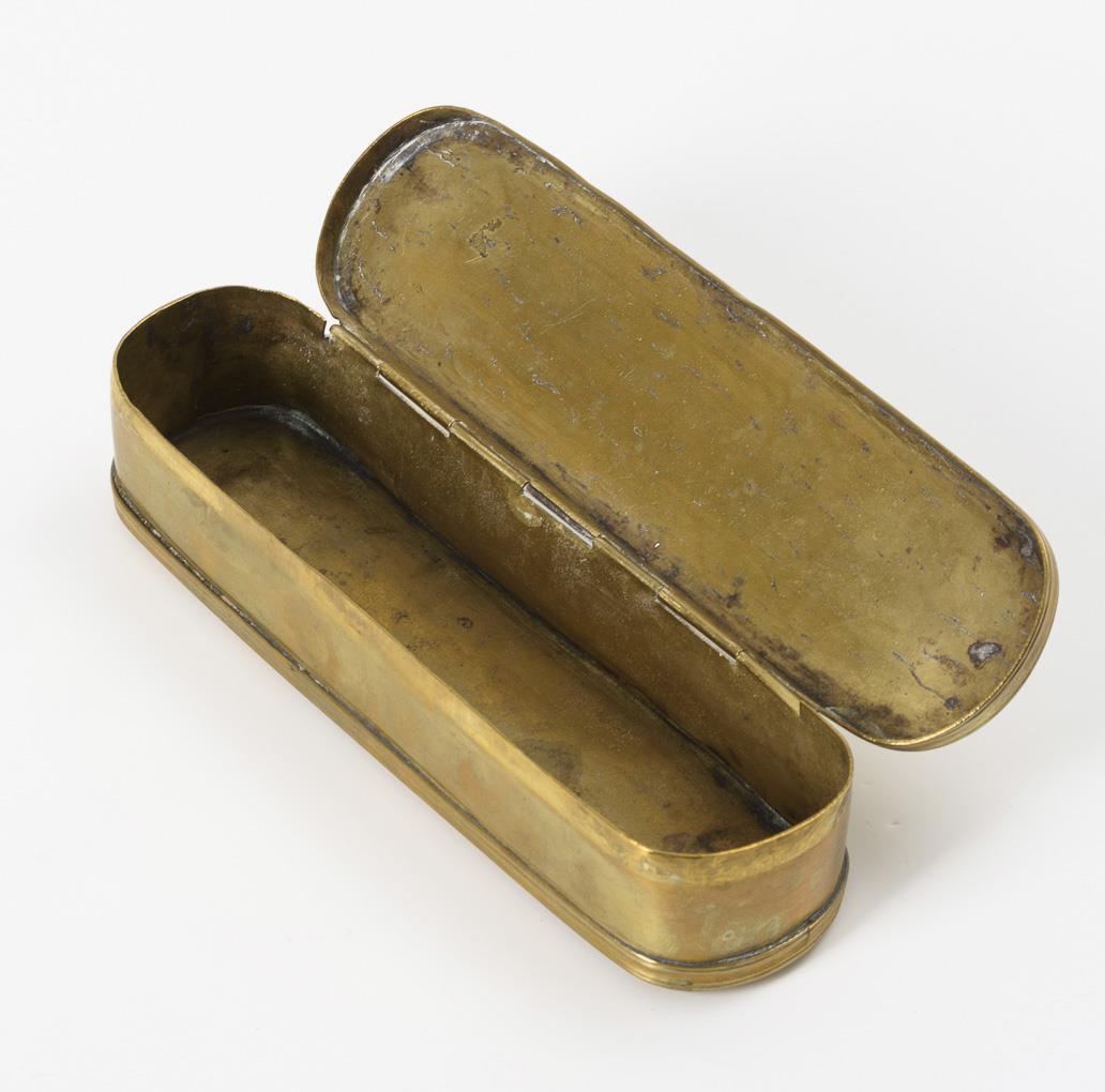 brass, embossed lid and bottom. 3 x 16 x 4.5 cm.