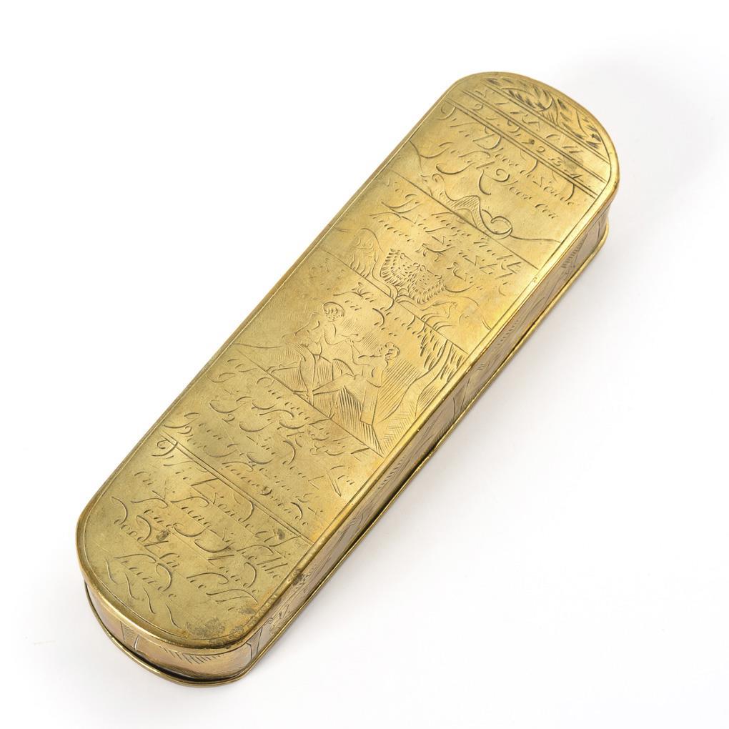 In the manner of Iserlohn tobacco boxes engraved all over: ox and donkey after Isaiah and pair of lions and men after Sirach, respectively; each with Dutch inscription. On the wall surrounding hunting scenes. Some signs of age / use.