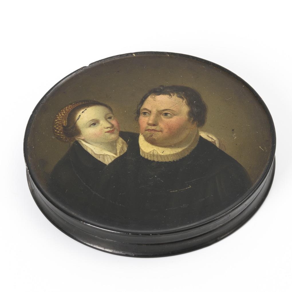 Biedermeier lacquer box with double portrait: Martin Luther and Katharina von Bora.