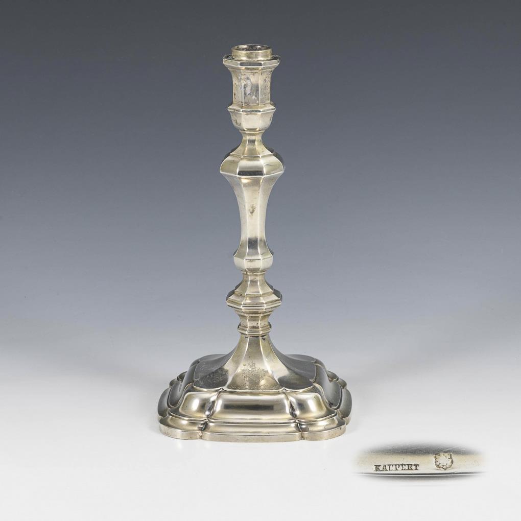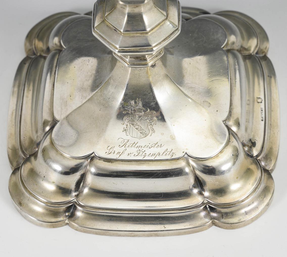 1-flame chandelier with baluster stem and 2 coat of arms engravings at the foot: "Rittmeister Graf v. Itzenplitz" and "Seconde Lieutenant Albert Prinz zu Schleswig Holstein". Traces of use, drip plate missing.
