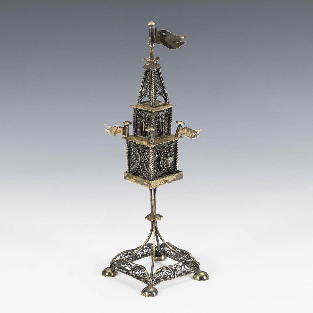 Jewish spice container with silver filigree, in the shape of a tower. Signs of use, small dents.