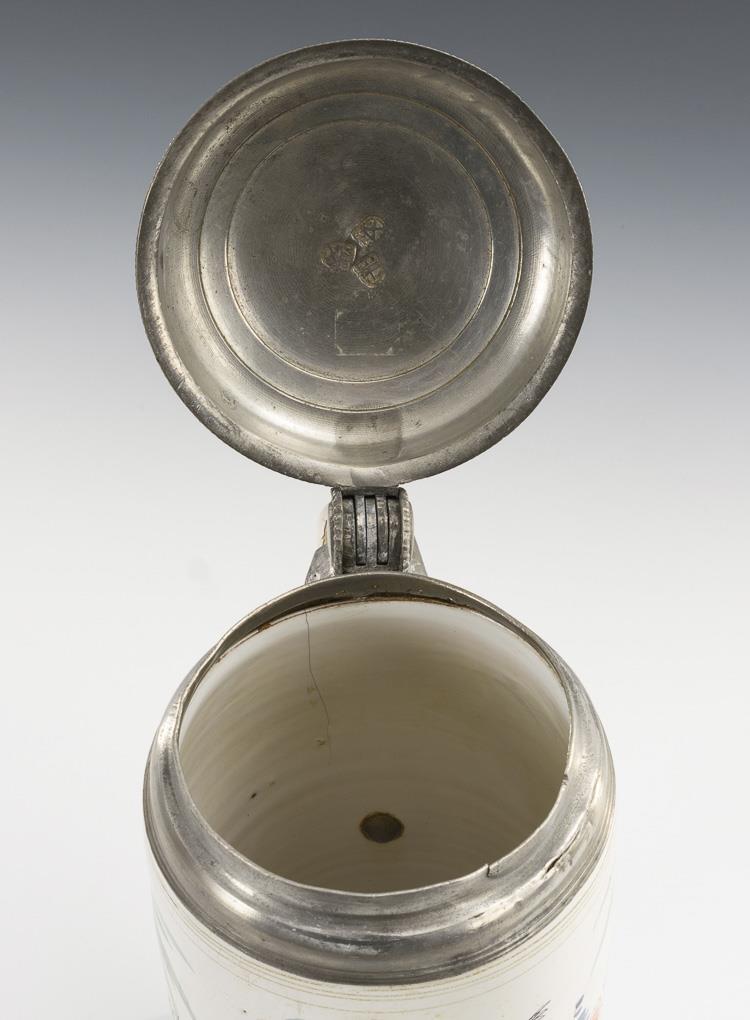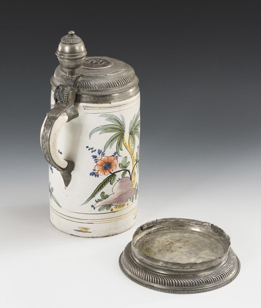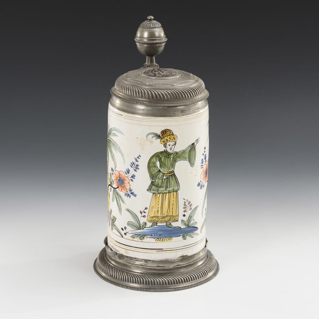 Cylindrical jug with ribbon handle. On the front side a noble lady in stylized landscape. Profiled pewter lid with ball pusher and relief plaque, hallmarked inside, pewter stand loose. Defects and repairs to the pewter, slightly hair cracked at the mouth, glaze defects and small bumps.
