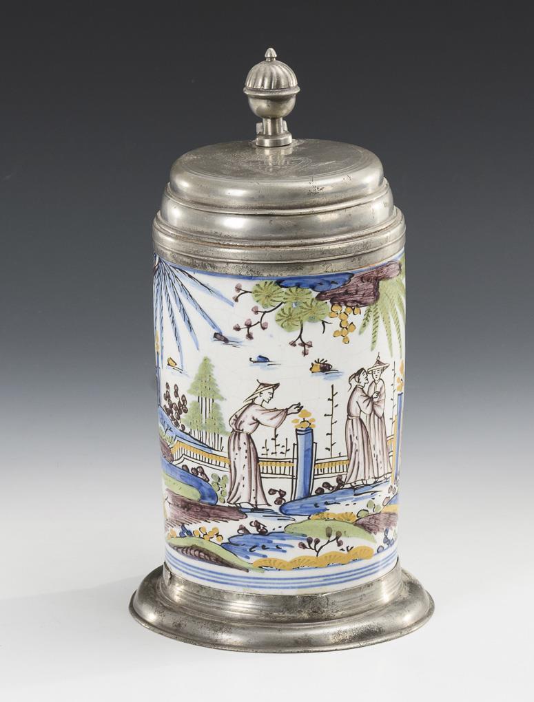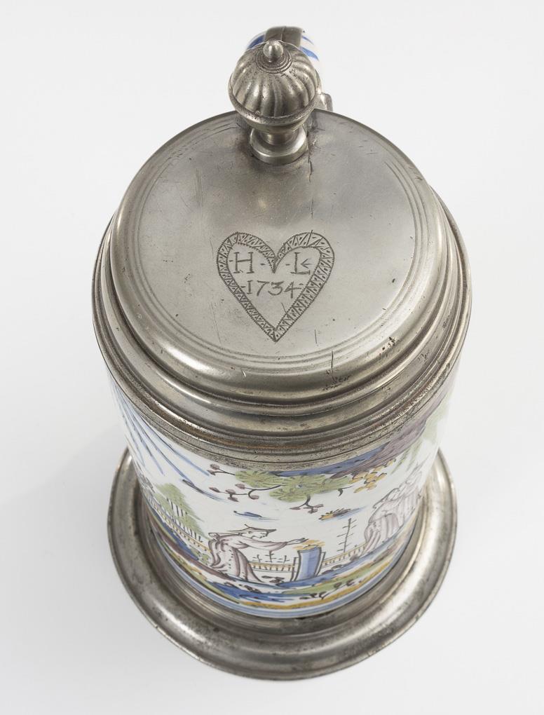 Cylindrical jug with line-decorated ribbon handle. On the front an Asianizing figure scene in stylized landscape. Pewter lid with ball pusher and heart engraving "HL 1734", pewter stand. Partial glaze defects, signs of age and defects on the pewter.