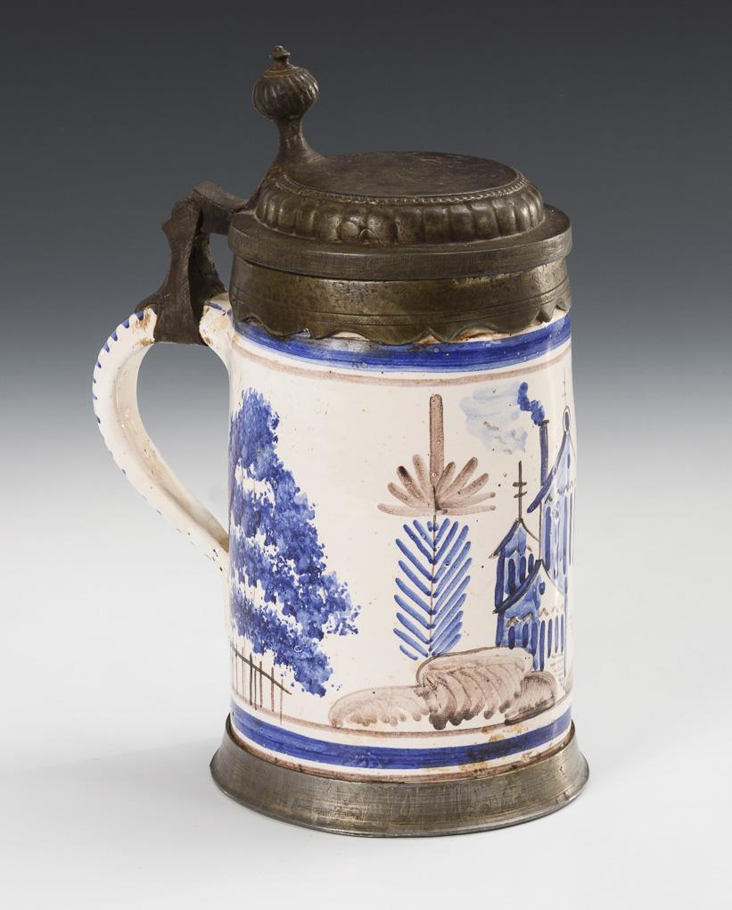 Cylindrical jug with line decorated ribbon handle. On the front side a group of houses between tumbled storey trees. Profiled pewter lid with ball pusher, indistinctly engraved "[...] 1804", pewter stand ring. Partially light glaze defects and rubbing, pewter with signs of age and use.