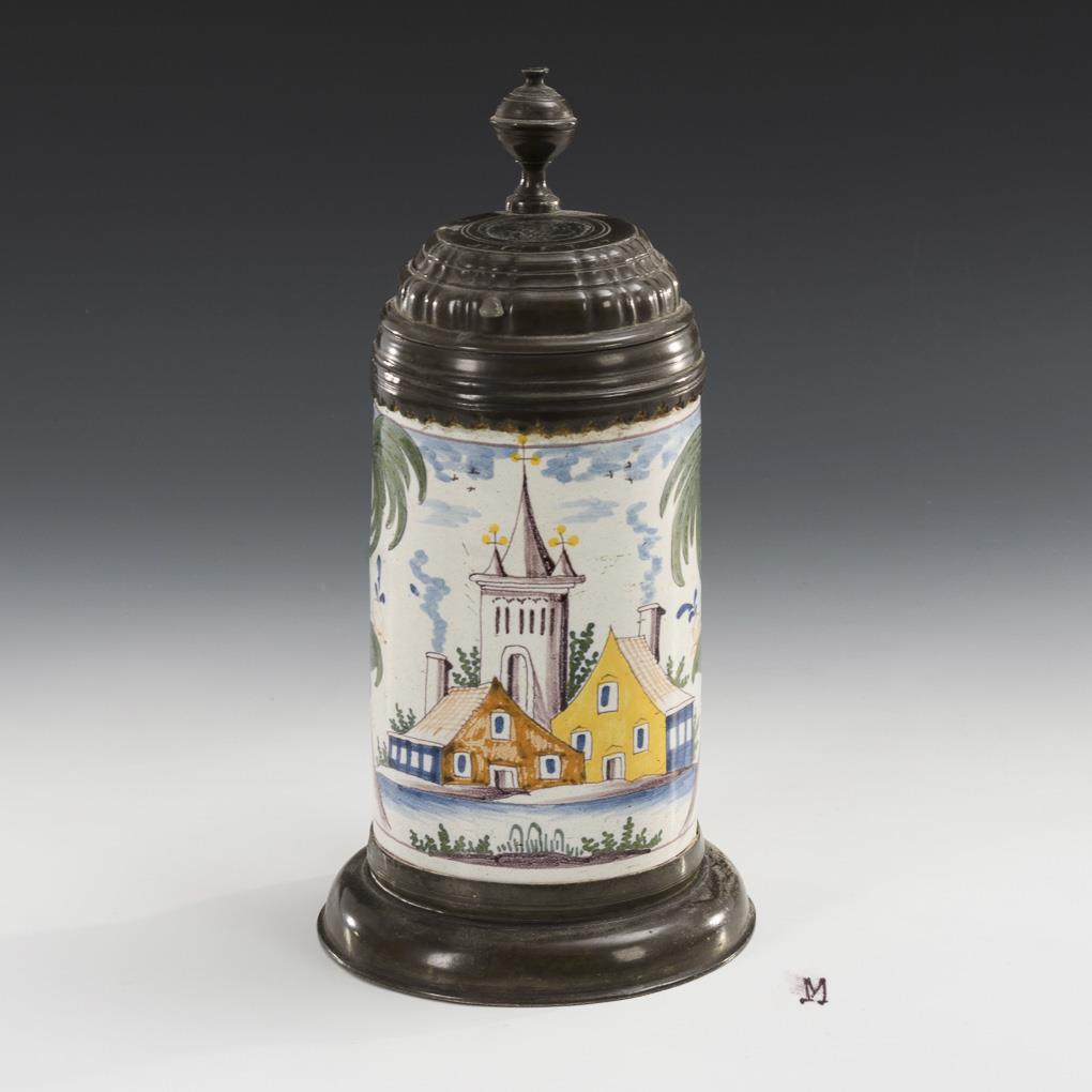 Cylindrical jug with line-decorated ribbon handle. On the front a church village between trees. Profiled pewter lid with ball pusher, indistinct plaque engraved "CFP 1797", hallmarked inside, pewter stand ring. Partially minimal glaze defects and rubbing.