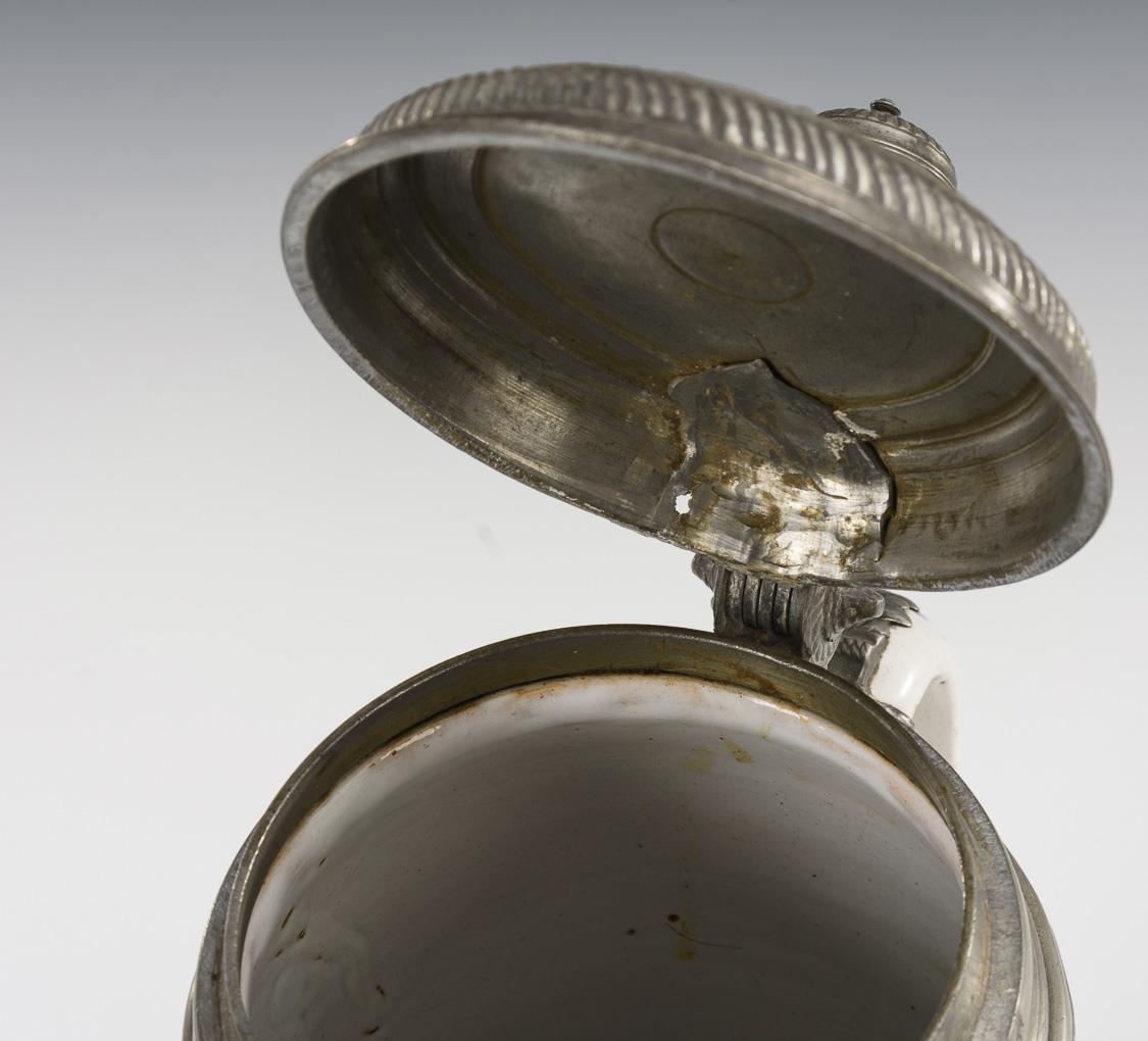 Cylindrical jug with spiral decorated ribbon handle. On the front a striding stag in stylized landscape. Profiled pewter lid with ball pusher. Partially minimal glaze defects and rubbing, signs of age and defects on the pewter, pewter stand missing.