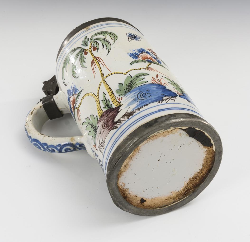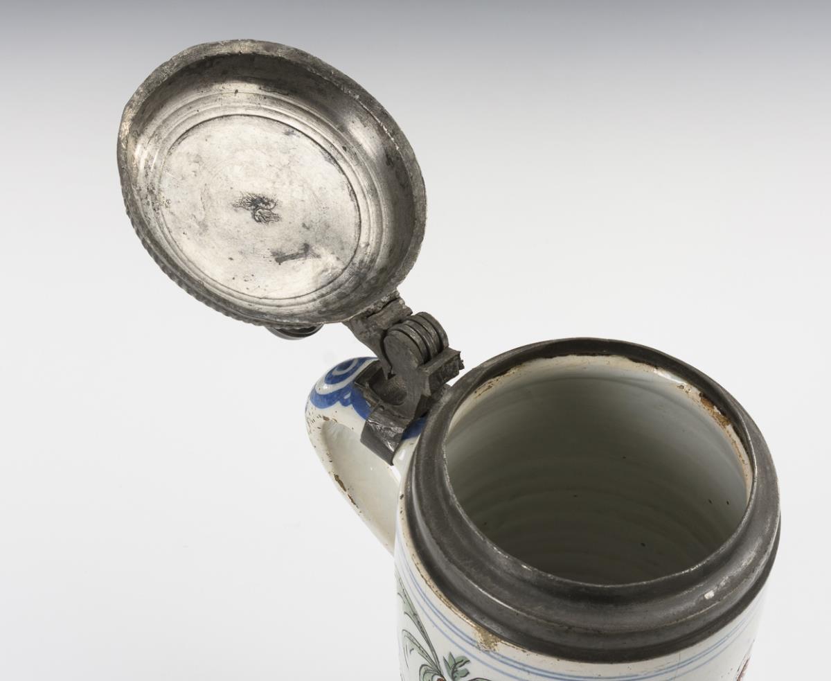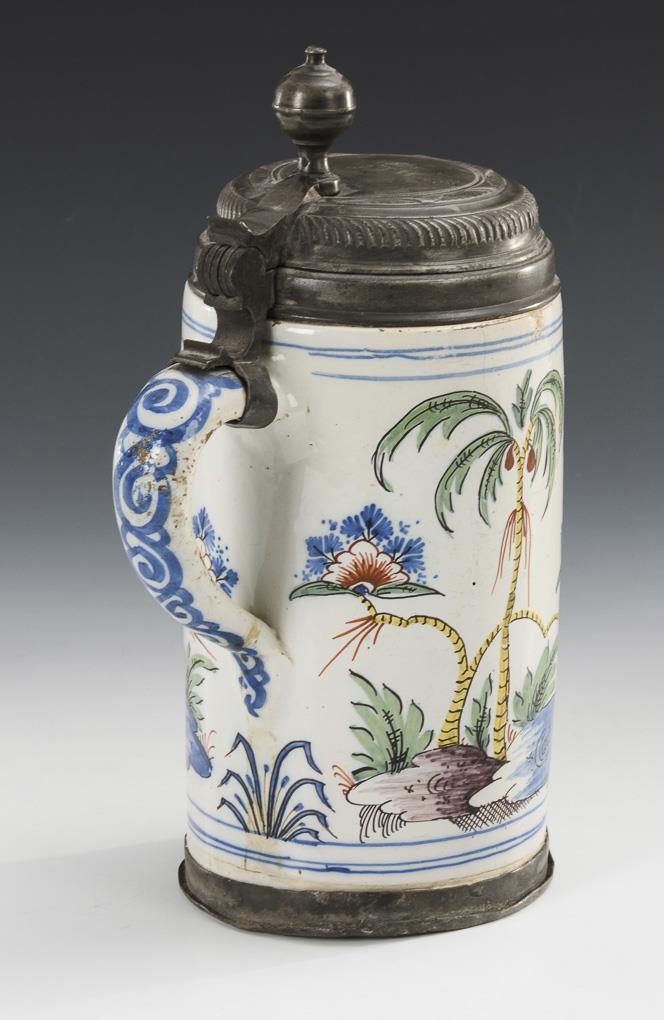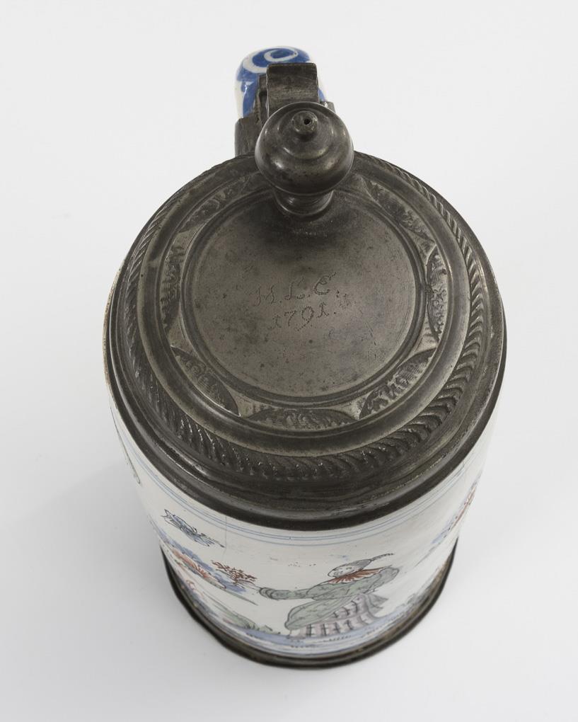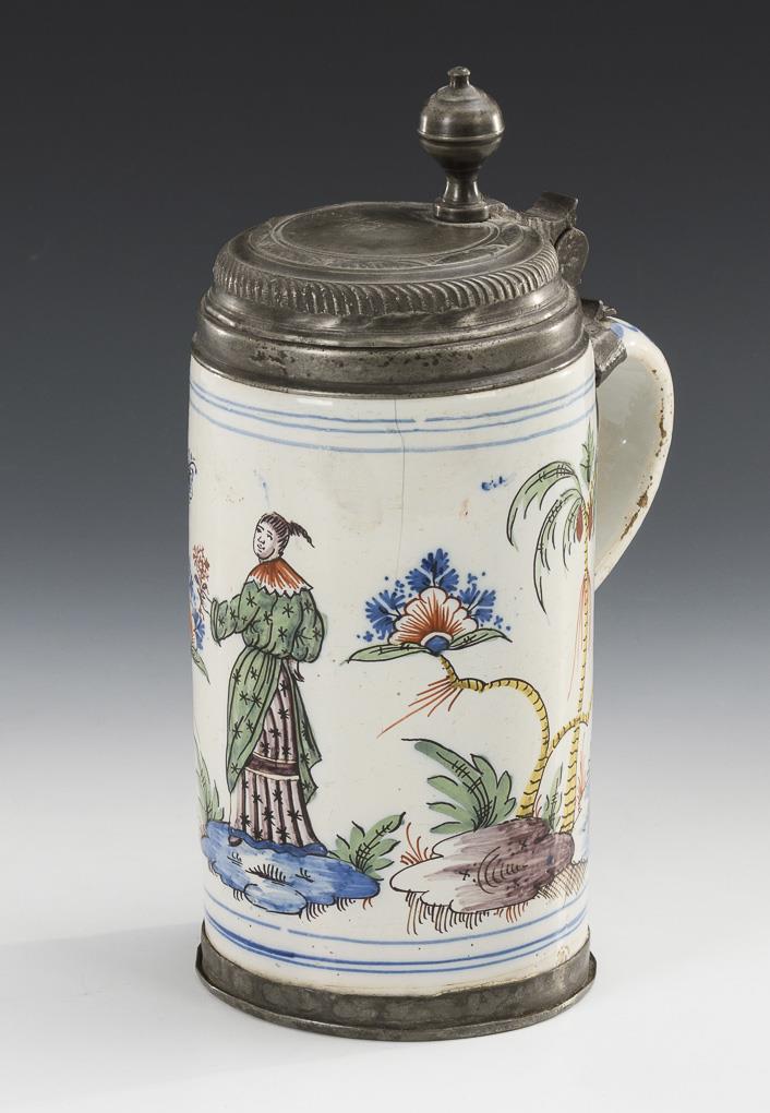 Cylindrical jug with spiral decorated ribbon handle. On the front an Asianizing figure in long robe in stylized landscape. Profiled pewter lid with ball pusher, engraved "HLE 1791", hallmarked inside, pewter stand ring. Fine mouth cracks, partial minimal glaze defects and rubbing, defects and flaws on the pewter.