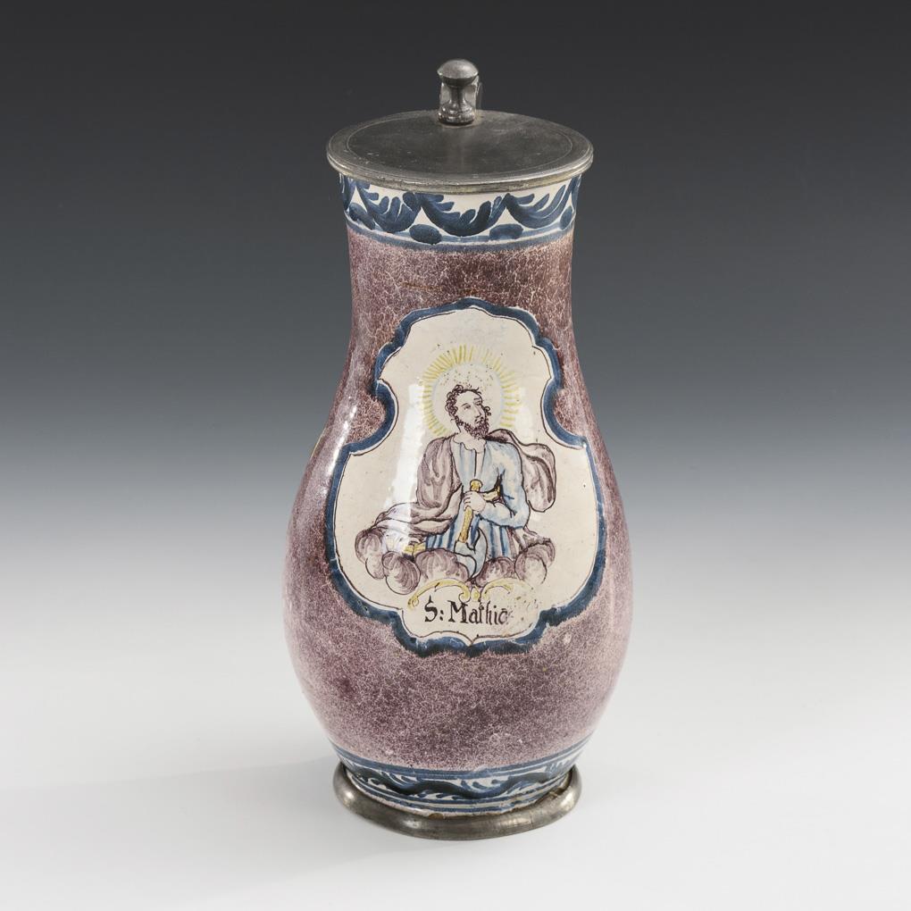 Fayence pear jug with Saint Matthias. Gmunden.