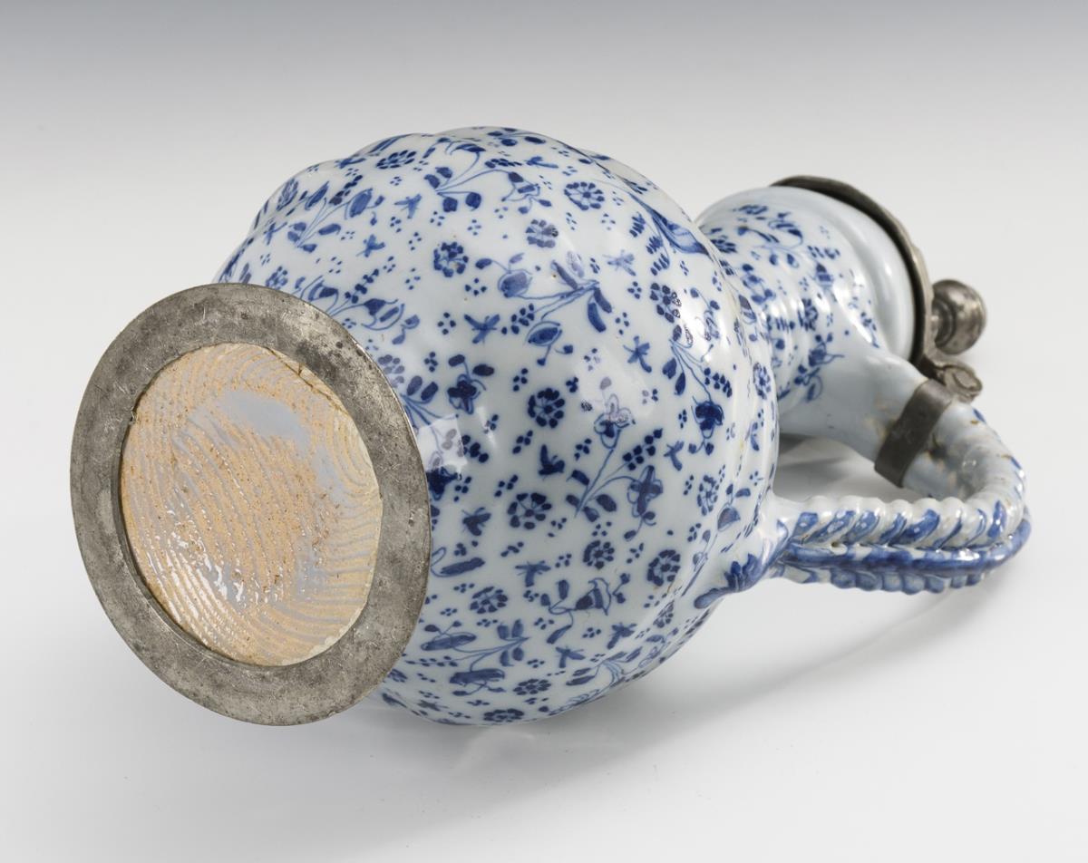 Sphere bellied jug with godroned wall, cross-grooved narrow neck and braided handle with central bridge, round foot. Profiled pewter lid with ball pusher, pewter stand ring. Partially glaze rubbed and slightly bumped, glued at the stand, pewter with signs of age and repairs.