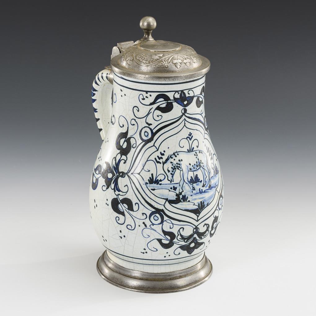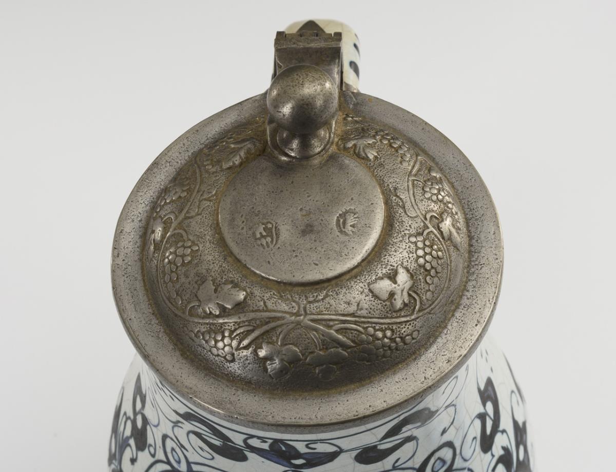 Pear jug with ribbon handle. On the front a curved cartouche with grazing horse. Profiled pewter lid with vine leaf reliefs and ball pusher, hallmarked, pewter stand ring.
