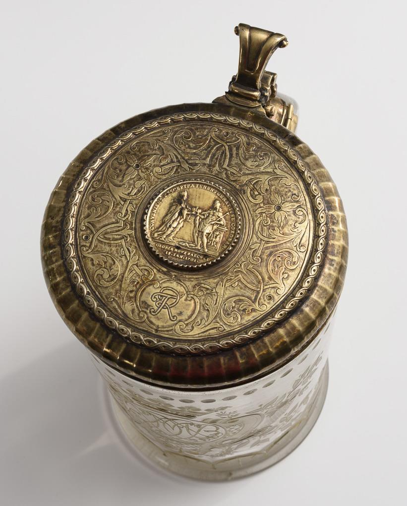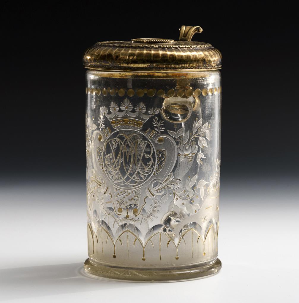 Colorless glass with gold staffage; silver, gilded. H 20 cm.