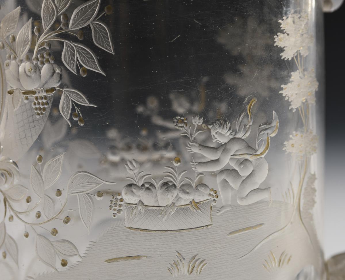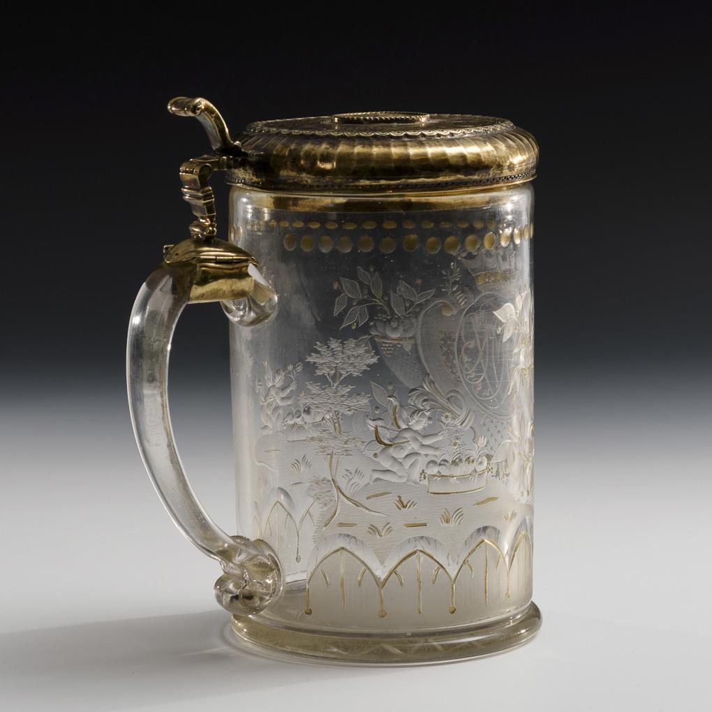 Roller jug with ribbon handle and gilded silver lid (2 fused 18th century hallmarks/1 indistinct master hallmark/Windhound's head 3 [= 800 silver, Austria, from 1867-1922, probably hallmarked]); dislocated demolition. Between a spherical frieze and a matted pointed leaf wreath on the stand the cut, partly gilt depiction of a ligatured monogram in a crowned escutcheon, framed by cornucopias with fruits and tendrils, on either side respectively a landscape island with tree as well as a cupid boy with fruit basket. Elaborately crafted lid with engraved ribbon work as well as an inserted medal on the coronation of Frederick I (1657-1713) as Prussian king on January 18, 1701. Gold partially somewhat rubbed.