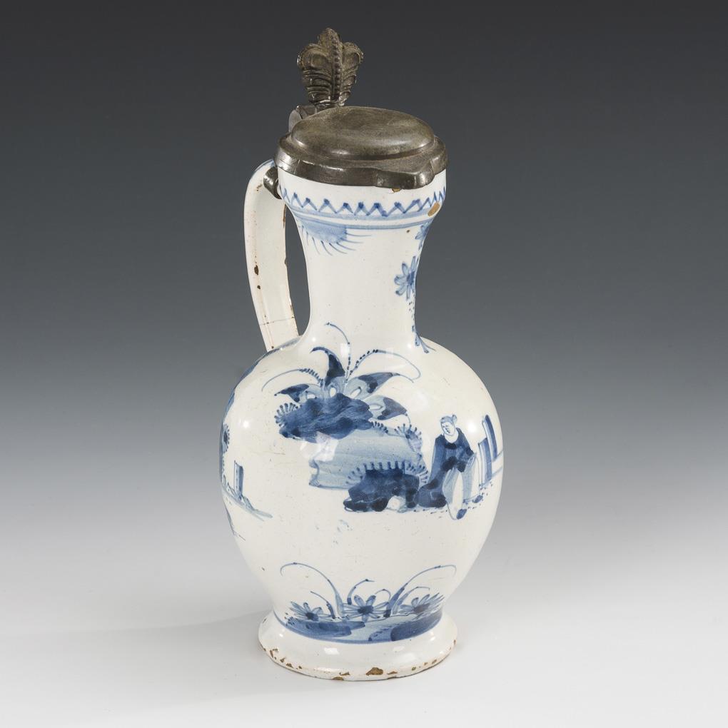 Sphere bellied jug with high narrow neck and spiral decorated ribbon handle. On the front side an Asianizing figure in sketched landscape. Pewter lid with shell pusher. Partly glaze defects and bumps, handle cracked, pewter with signs of age.
