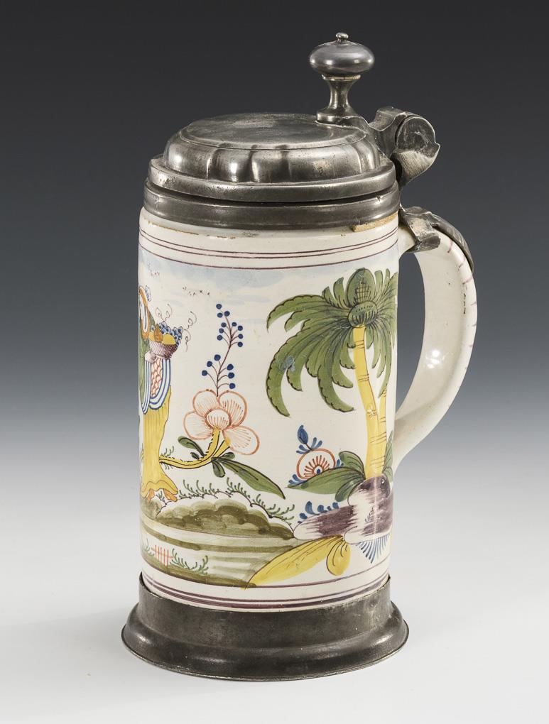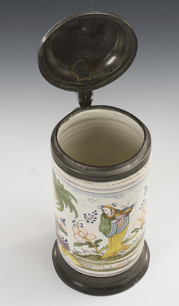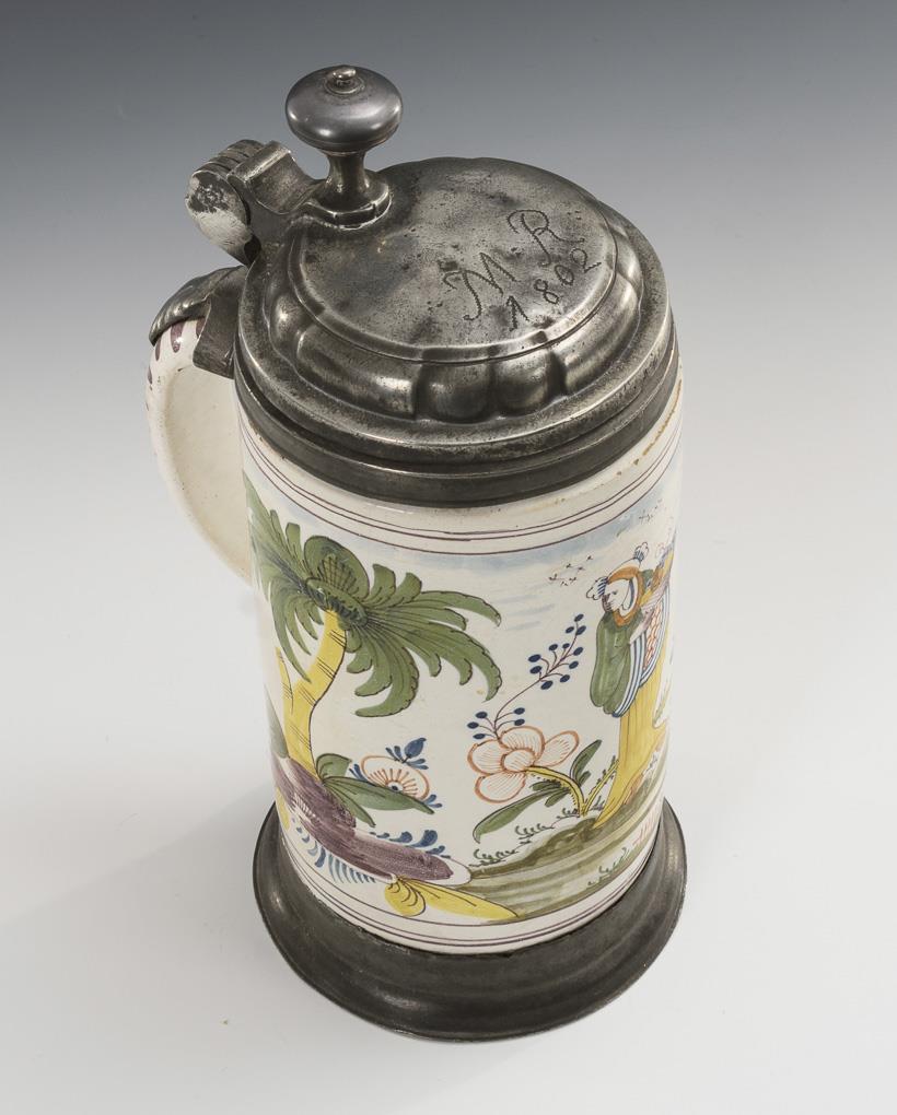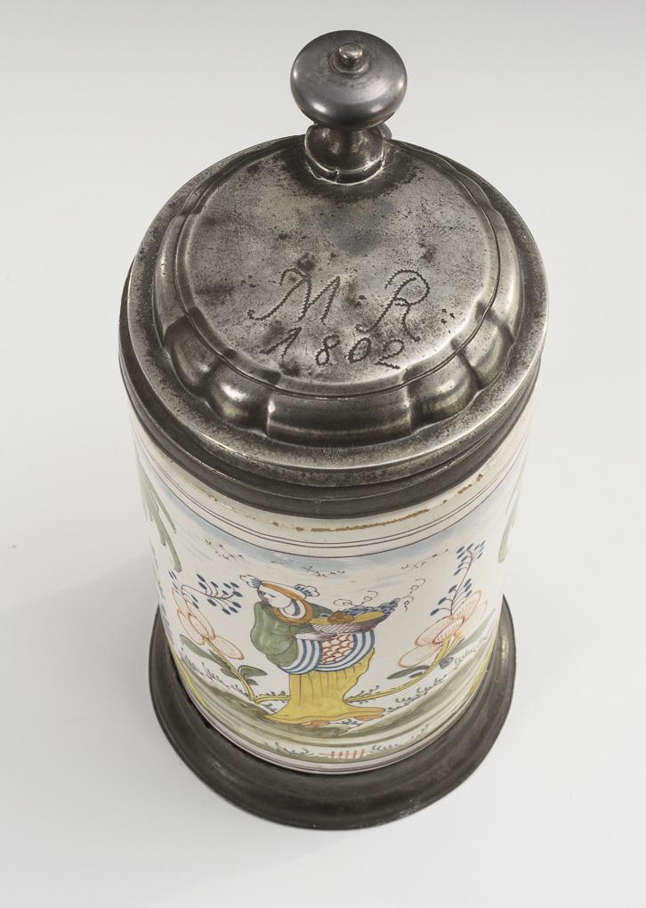 Cylindrical jug with line-decorated ribbon handle. On the front an Asianizing figure with fruit basket in stylized landscape. Profiled pewter lid with ball pusher, engraved "MR 1802", linen stain inside, pewter stand ring. Restored, defects, repairs and missing parts on the pewter.