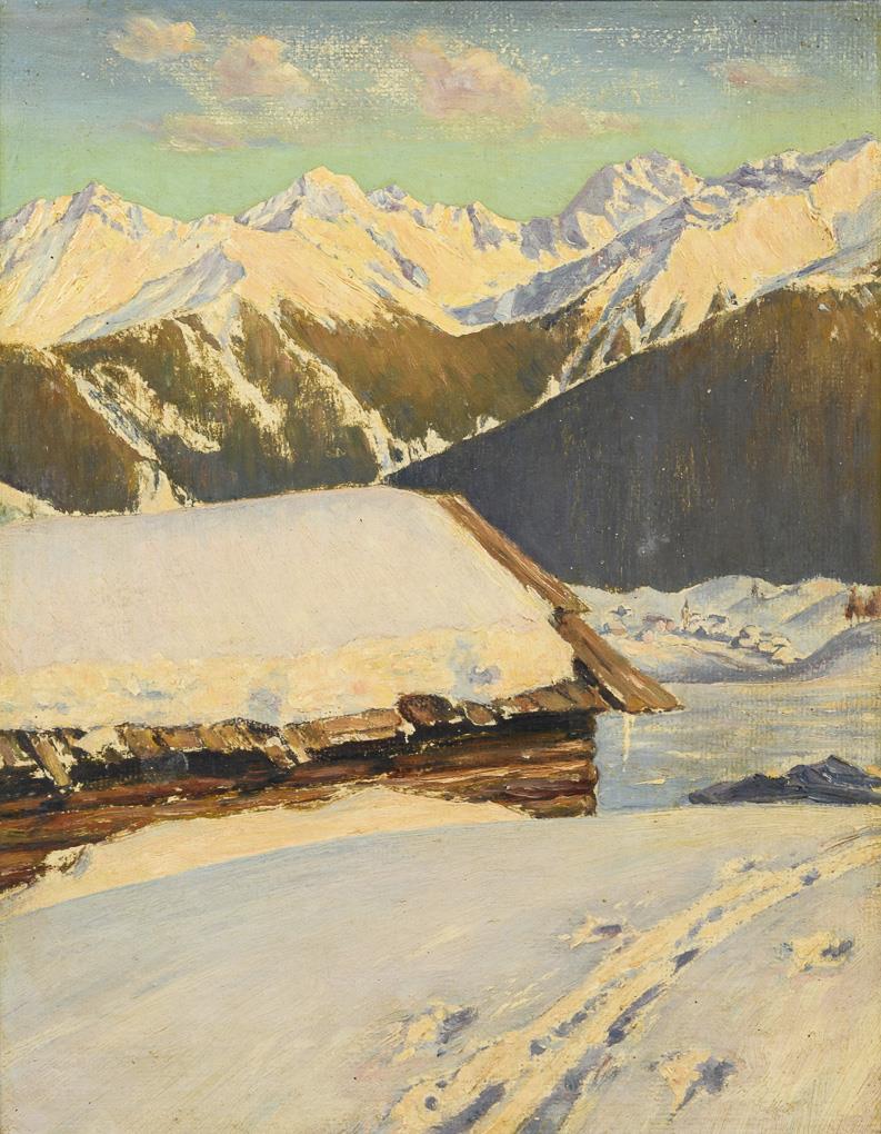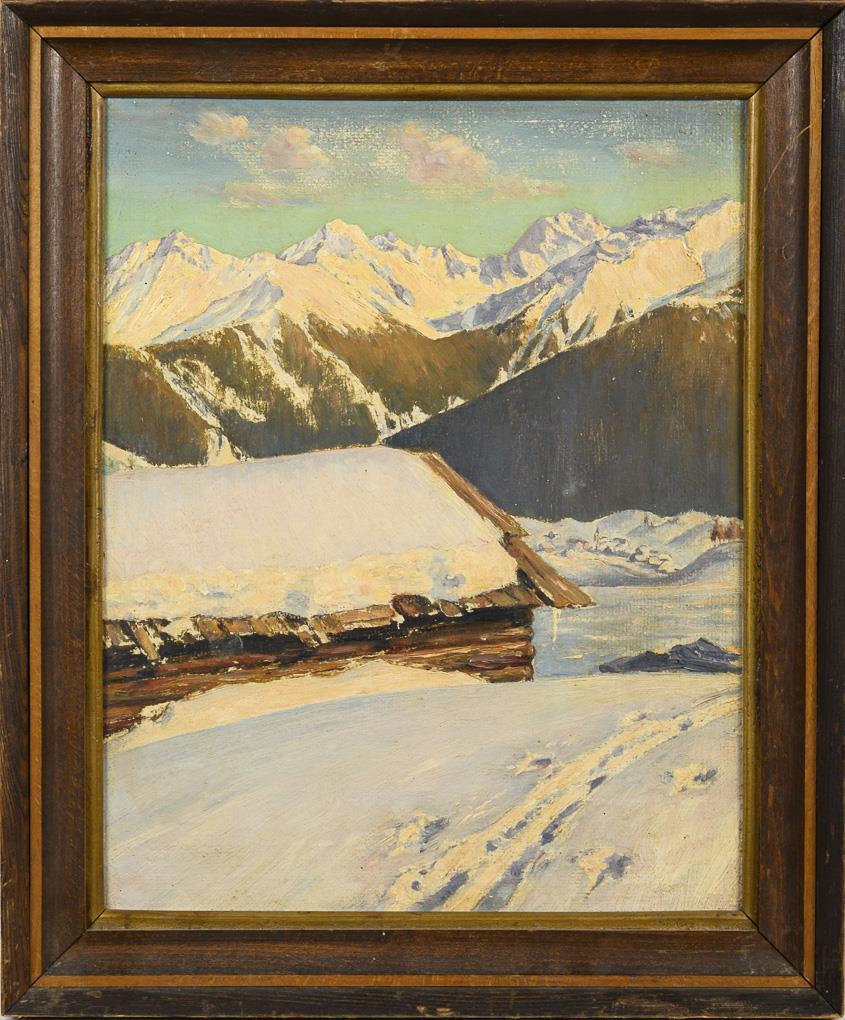 Snowy mountain hut on the slope with view over the valley to the mountains on the horizon in the sun.